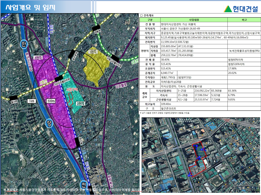 총3개동으로 건설될 가산현대지식산업센터는 a동25층, b동21층, c동28층 규로로서 연면적 78,414.89평 규모 건폐율34.43%로서 공개공지 면적을 크게늘리고 전체면적에서 조경면적을 17.98%에 공개공지면적만해도 20%에 달합니다. 서울지식산업센터중 가장큰 규모의 아파틋형공장으로 지식산업센터65,368평, 기숙사 5,323평 그리고 근린생활시설이7,724평이 건설되는등 그야말로 초초대형 지식산업센터이죠. 서울을 대표하는 여의도63빌딩이 약168,000제곱미터 규모라 하니 현대지식산업센터가 얼마만큼인지 가늠이 되실것입니다.