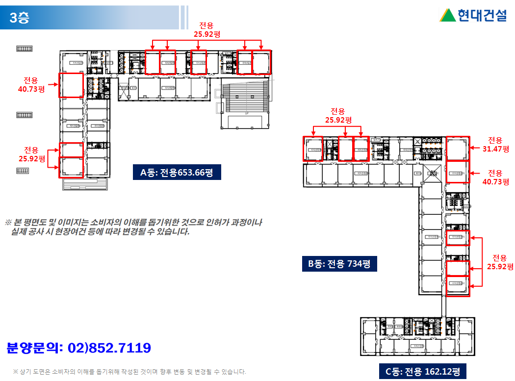지하층의 설계변경이 있어 지하층 도면을 제공해드리지 못하는데, 지하1층과 지하2층에 제조또는 물류시설용도의 지식산업센터가 들어섭니다. 층고가 높고 특히, 하역장이 지하2층에 설치되므로 지하공장을 매입할분들은 양이 한정적이라 서두르셔야 할거같네요. 본격적인 지식산업센터 출발점인 3층도면입니다. 층별 면적도 전용162평에서 734평까지 회사에 맞게 1개층을 사용할 수있는 방법이 있어 선택이 폭이 넓네요.