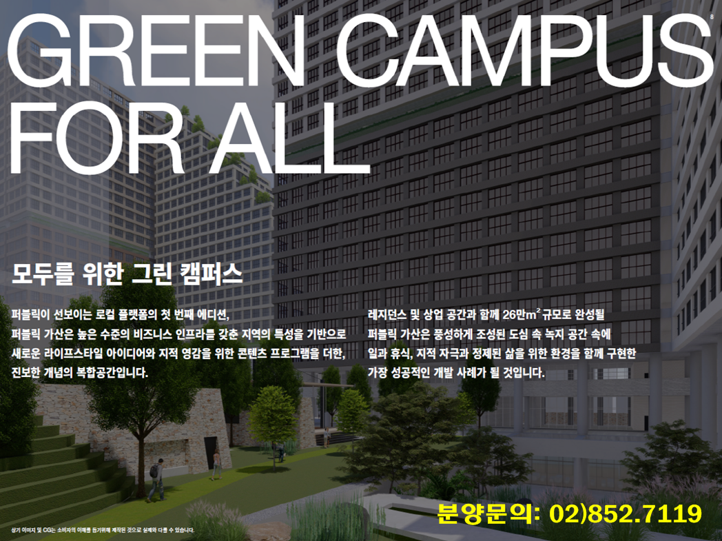 뻔해보이는 이야기 같지만 그동안의 가산디지털단지 지식산업센터분양 현장에서는 찾아볼 수없었던 스토리와 계획을 가진 아파트형공장 분양 현장으로 보이더군오. 퍼블릭이라 명명한것 또한 특정지역장소가 아닌 지역전체를 아우르는 꼭필요한 컨텐츠와 환경제공과 함께 기존의 업무환경과 자연스럽게 연결되는 로컬코뮤니티 전반의 삶의질 향상을 지향한는것이 퍼블릭이라느 설명입니다. 또한 그린캠퍼스를 표방한 현대가산퍼블릭은 모두를 위한 그린 캠퍼스를 내세우고 있죠.