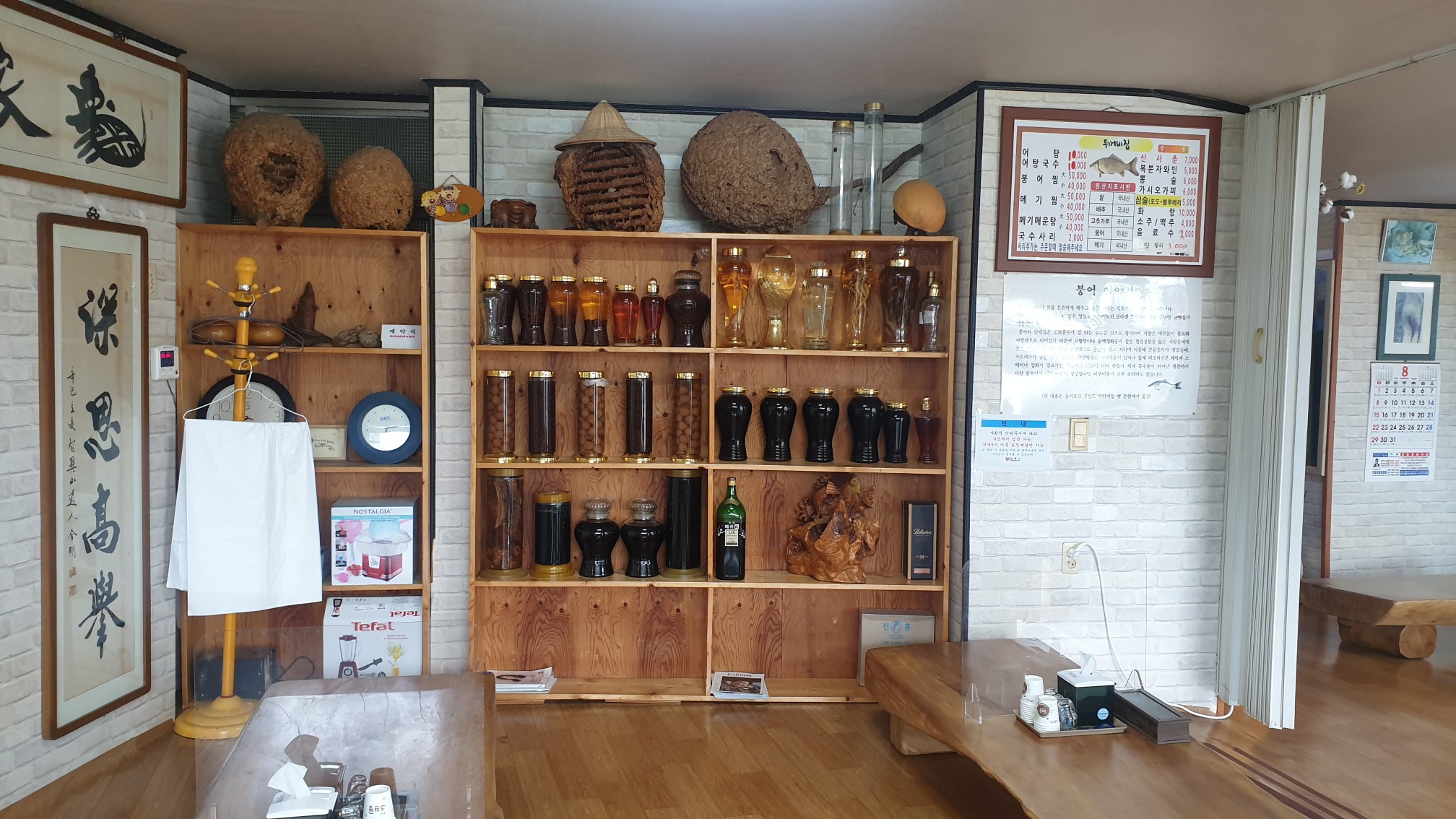 지리산자락 인월 식당 답게 벽면에는 담금주들이 즐비합니다. 저중에 산삼도 있을까? 물어보지는 못했습니다. 벽에는 붕어의 효능에 대해서도 써놓았는데 붕어는 위를 튼튼히 해주고 몸을 보하는 식품이라고 전해진다고 합니다. 건강한 피부를 위한 필수 영양소인 콜라겐과 아미노산이 풍부하고 단백질에 지방산이 함유되어있어 소화가 잘되면 동맥경화나 고혈압등 혈관질환에도 좋고 스테미너강화 와 어린이 성장발육에도 좋고 산후조리에도 좋다고 되어있네요. 이대로라면 어탕국수 한그릇에 건강을 다 담는거 같네요 ㅎ