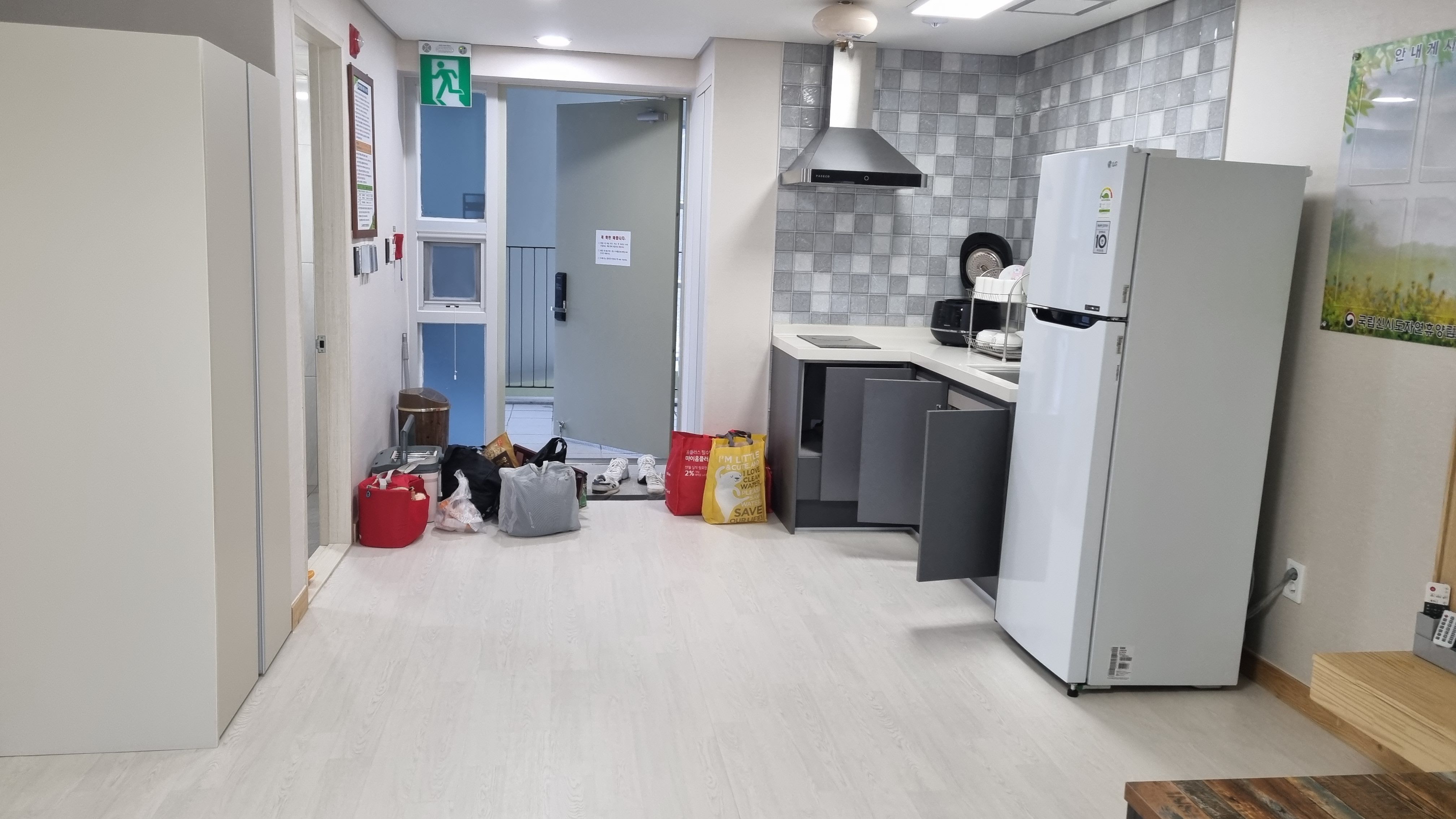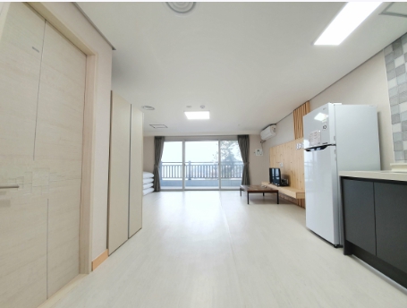 4인실이지만 8인도 거뜬할 정도 넓은데요 오픈한지 얼마안되어서 그런지 새것느낌이 물씬 풍기네요. 주방시설도 잘되어있고 냉장고도 큼지막하고 당연히 바닥도 뜨끈뜨끈 난방도 잘될수 밖에 없겠네요. 2층이지만 3층이라고 봐야하는데 엘리베이터가 설치되어있어서 짐을 나르는데도 무리가 없죠.