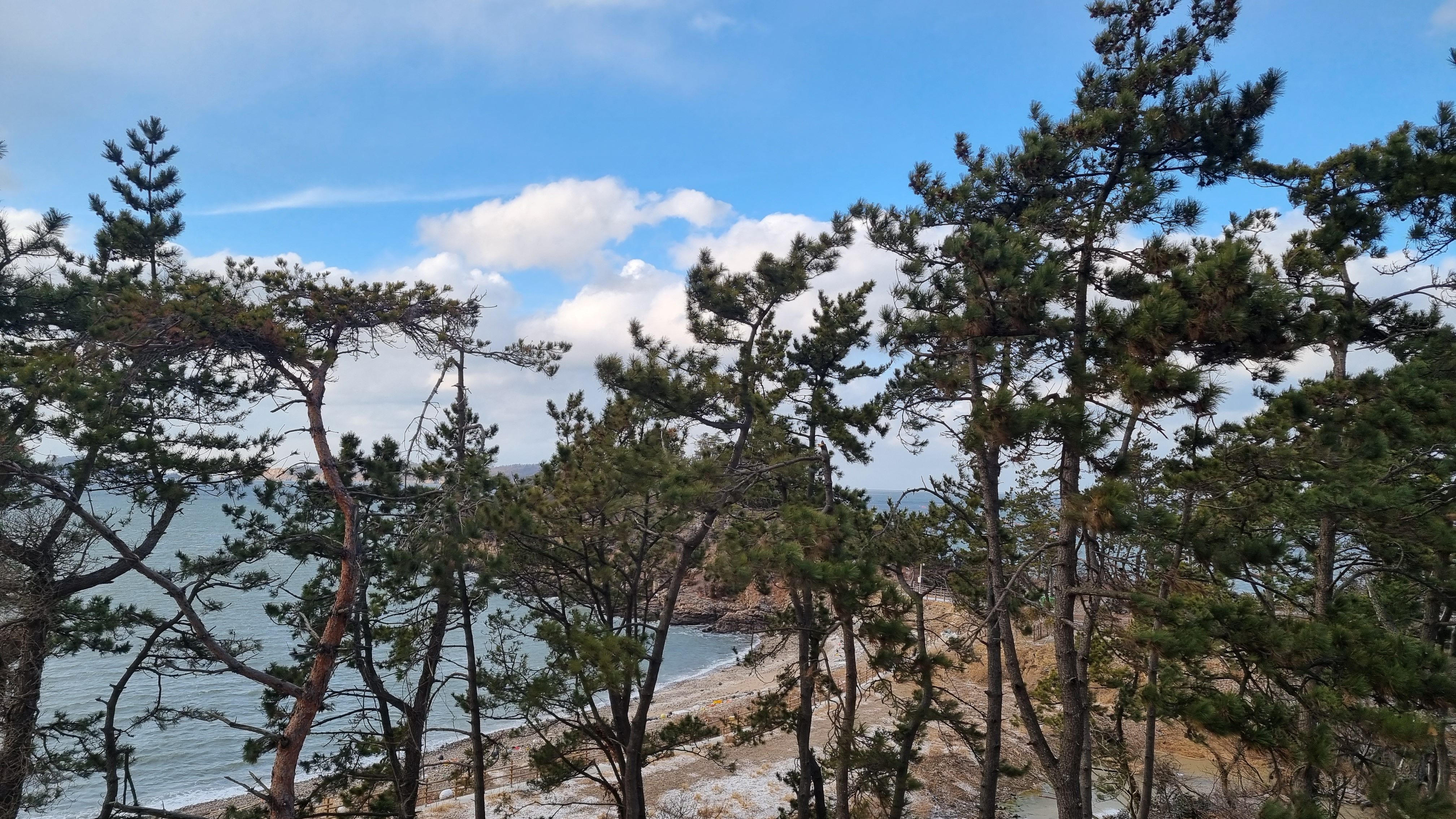 베란다에서 바라본 휴양림 바깥풍경입니다. 앞에 소나무들이 가리고 있어서 뻥뚫린 전망을 기대한분들은 다소 실망할 수도 있지만 개인적으로 소나무숲과 그사이로 보이는 바닷가가 더 매력적인 풍경이더군요. 오른쪽으로 휴양관하현달도 보이네요.
