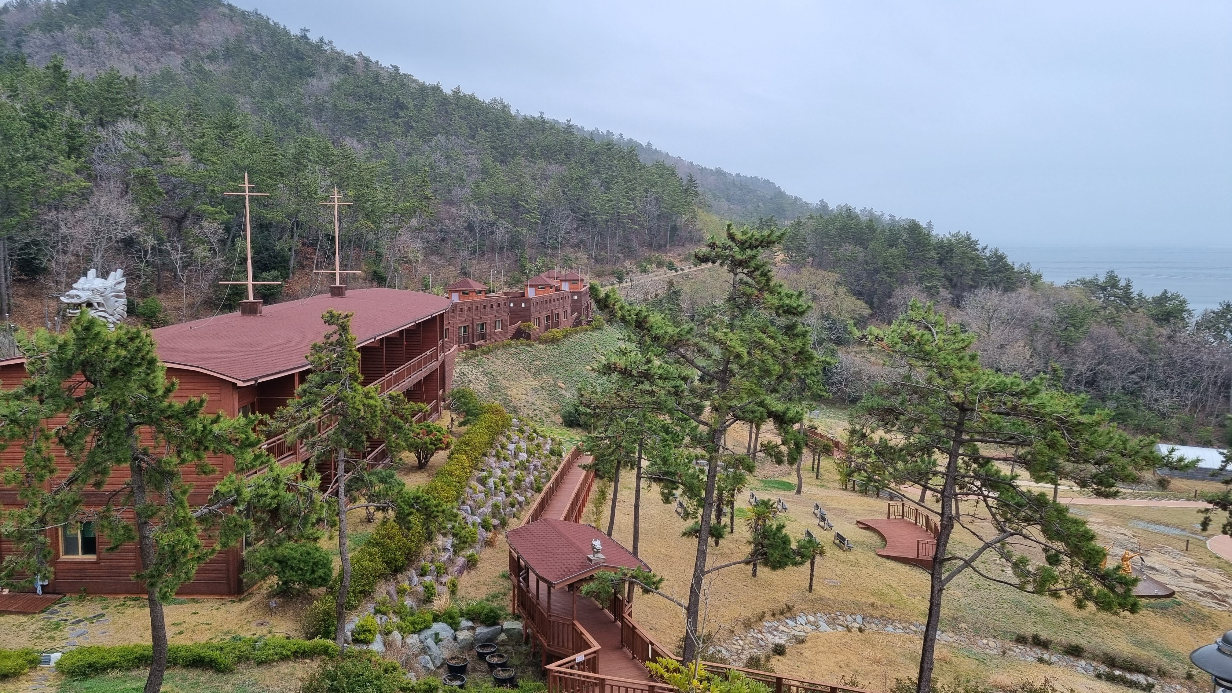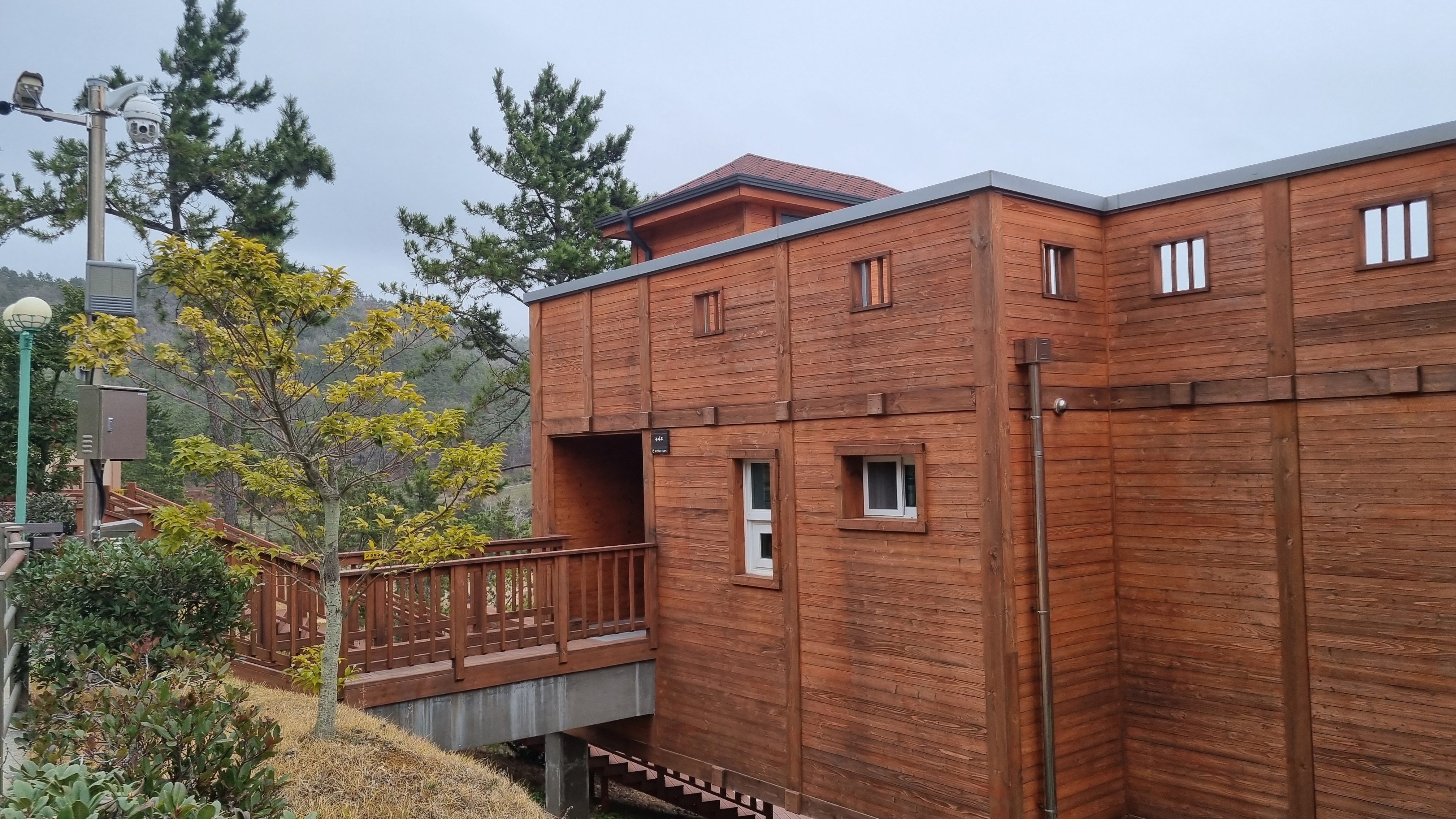 비탈진곳에 숲속의집을 만들었기 떄문에 바닷쪽에서 보면 기둥위에 집이 있는 형상이고 판옥선을 본따서 만든 숲속의집이라 여느 휴양림과는 색다른 느낌이 들죠. 사진처러 다리를 건너 건물로 들어갑니다.