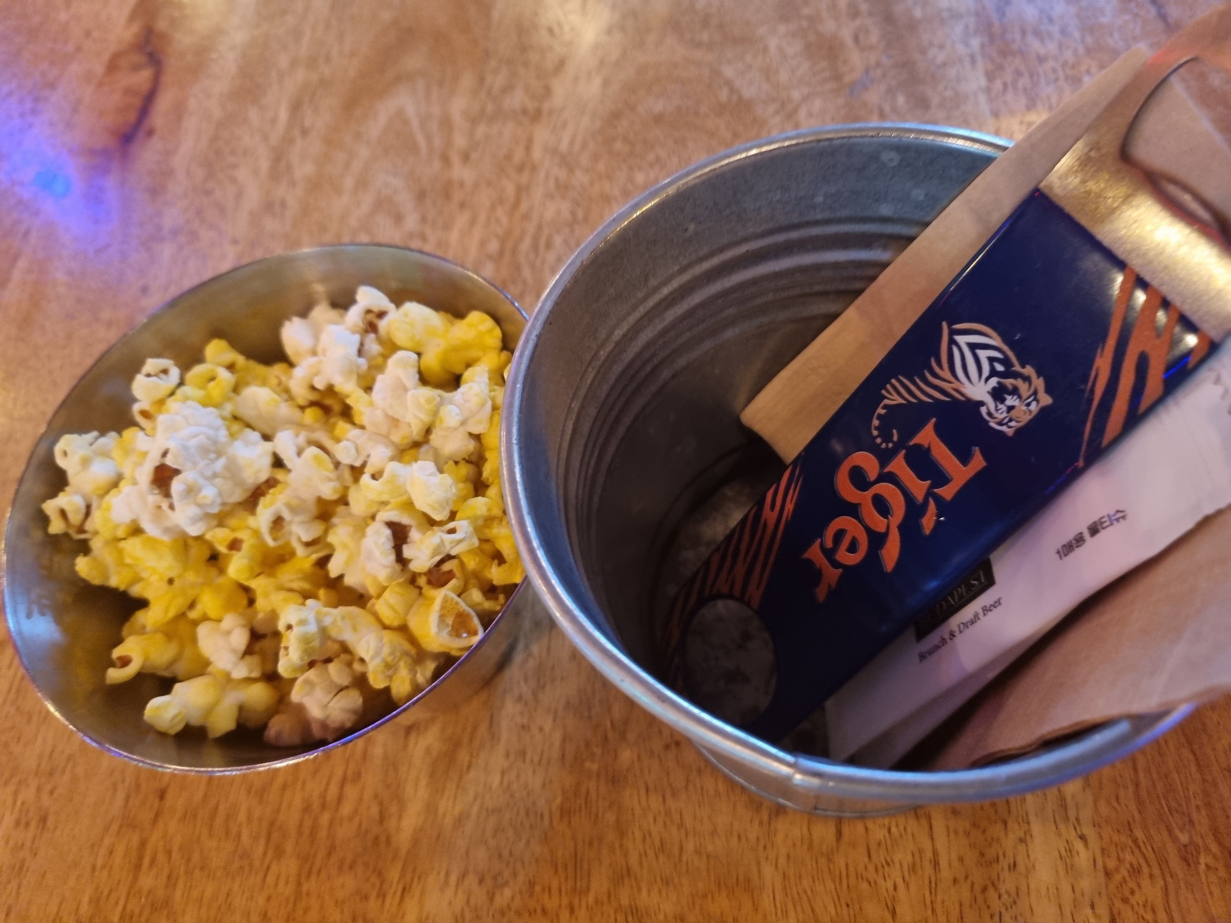기본안주로 팝콘과 함께 바구니에 티슈 병따개등을 줍니다