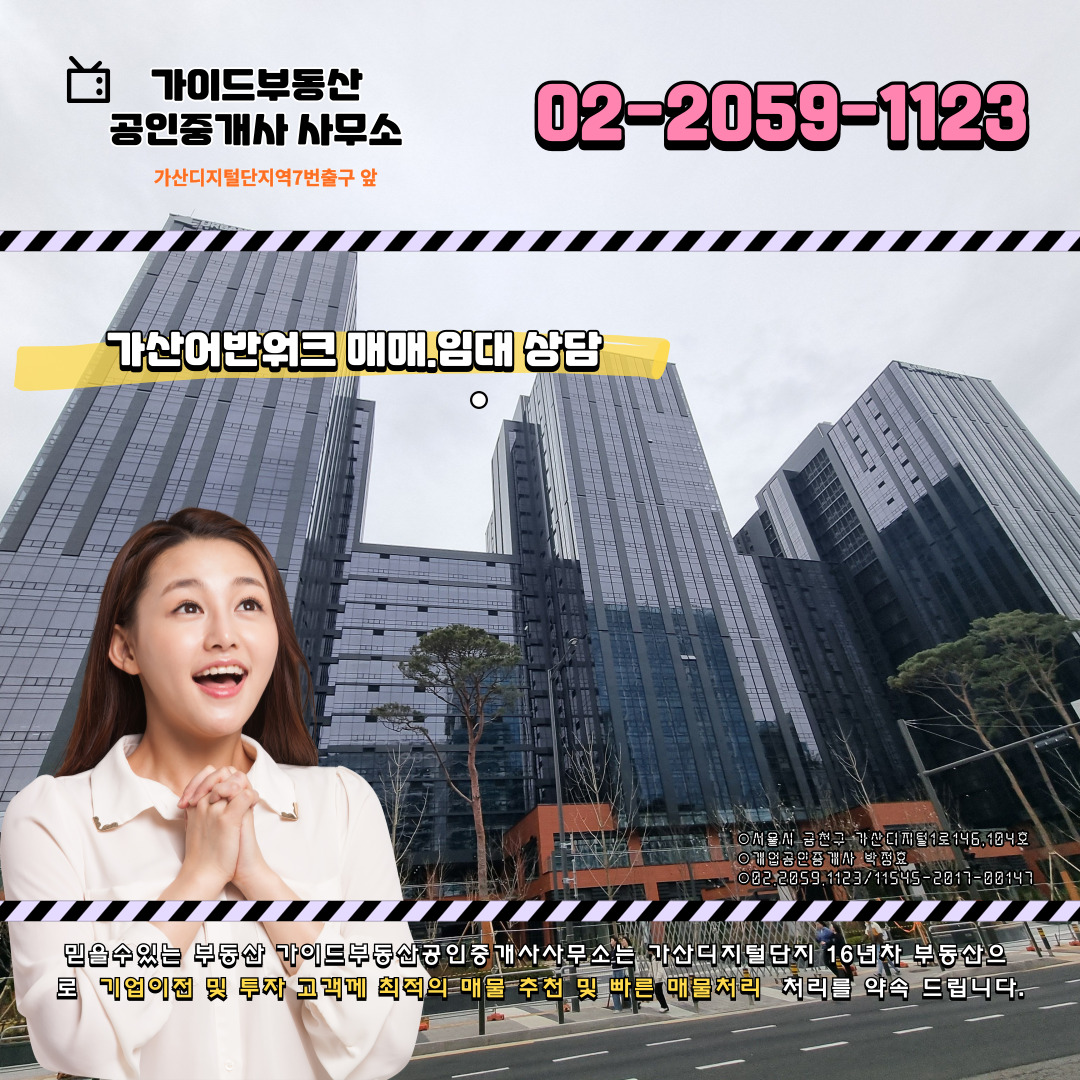 저희 가이드부동산은 가산지식산업센터 전문 중개업소로서 이곳에서만 16년째 소통하고 있습니다. 가산어반워크 임대 매물도 다수 보유중이고 금번 지식산업센터 재 분양 시작과 함께 분양 대행에 참여하고 있습니다.