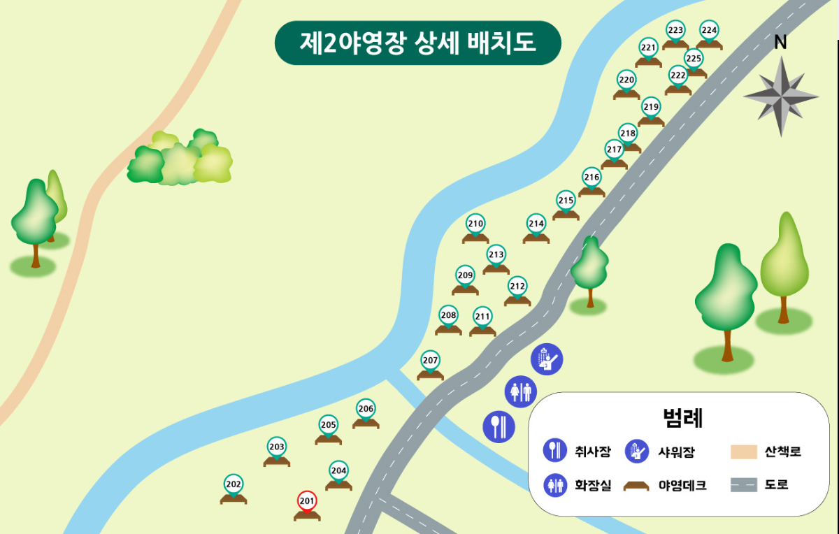 희리산자연휴양림 2야영장 배치도 입니다. 2년전과는 좀 달라진 것으로 보이는데 데크가 좀 줄지 않았나 싶어요. 많은 데큰들이 자리가 비슷한거도 같은데 일부는 간격히 좀 넓어진것도 같고 요즘은 프라이버시를 중시하는 세상이고 아침일찍 데크 사진을 찍는다고 해도 일찍 활동하는분들이 계서서 사실 촬영이 조심스럽거든요. 그래서 몇몇은 빠진부분이 있으나 이곳 희리산야영장은 어디를 예약하든 명당이니 어렵게 고민할 이유는 없는 곳입니다.