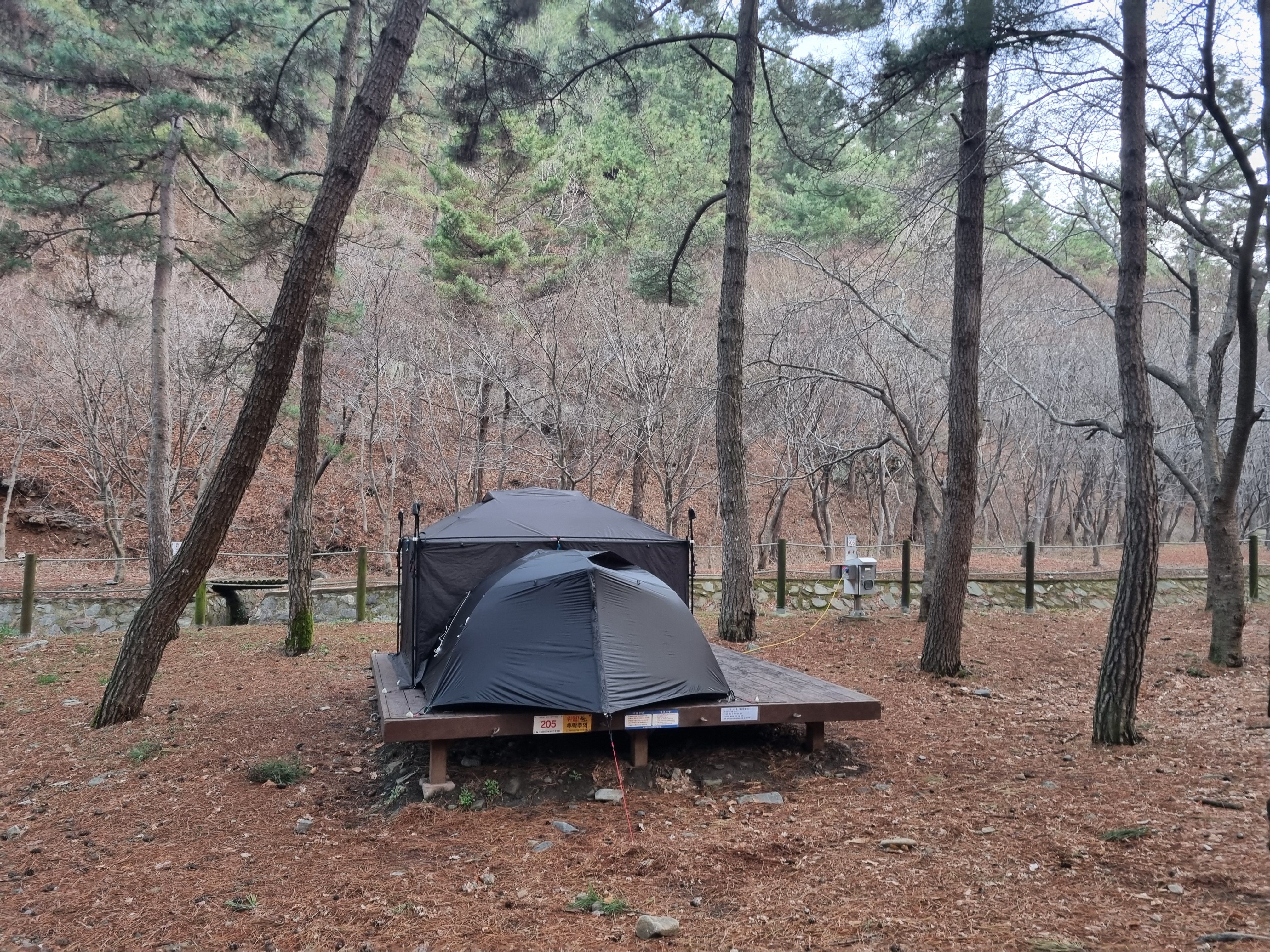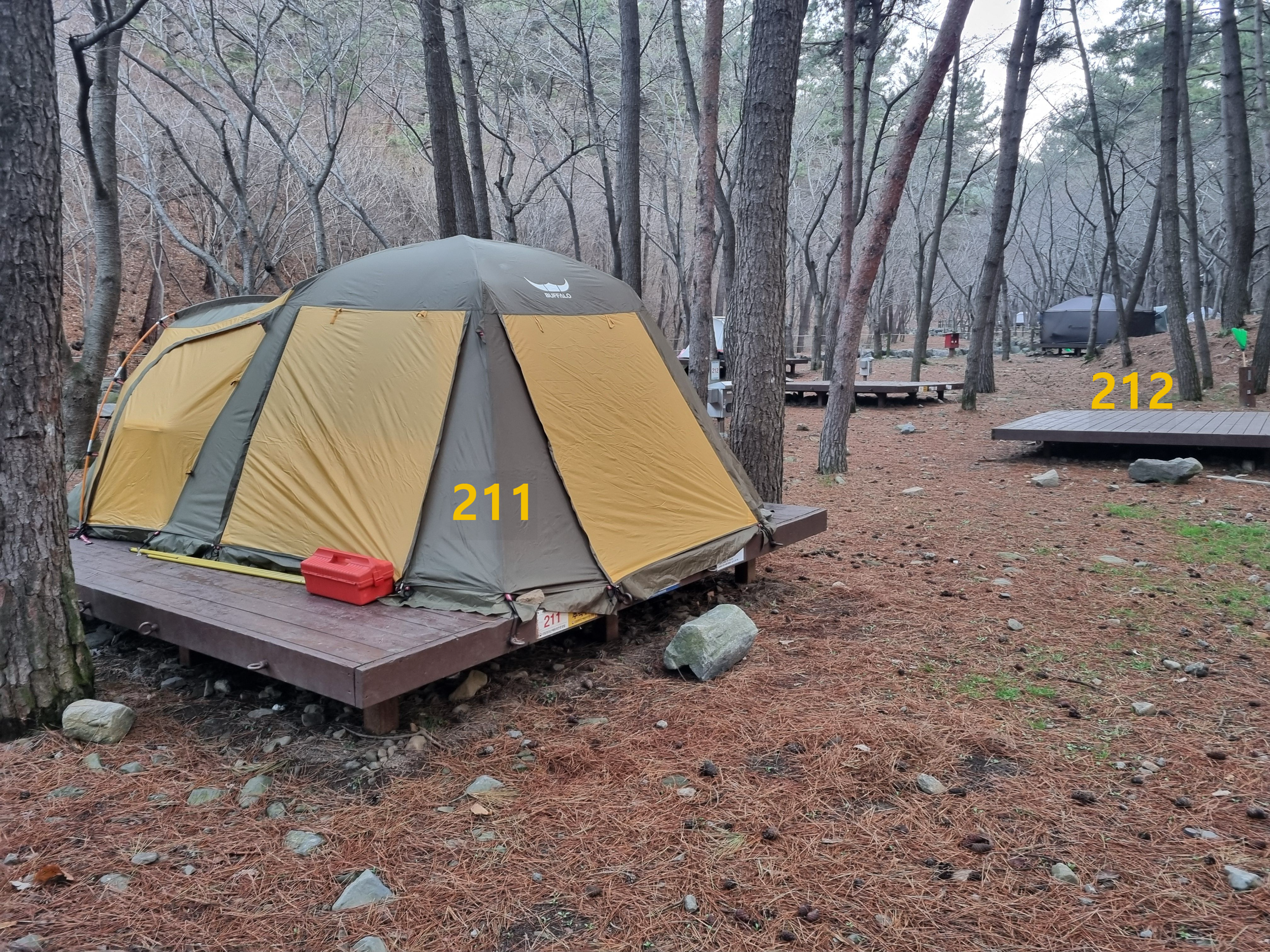 요즘 국립자연휴양림 야영장 데크에는 이브랜드 텐트나 쉘터를 많이 볼 수있는데요, 인기덕분인지 가격이 많이 올랐더라구요. 207데크도 계곡옆에 독립적이고 좋아요.