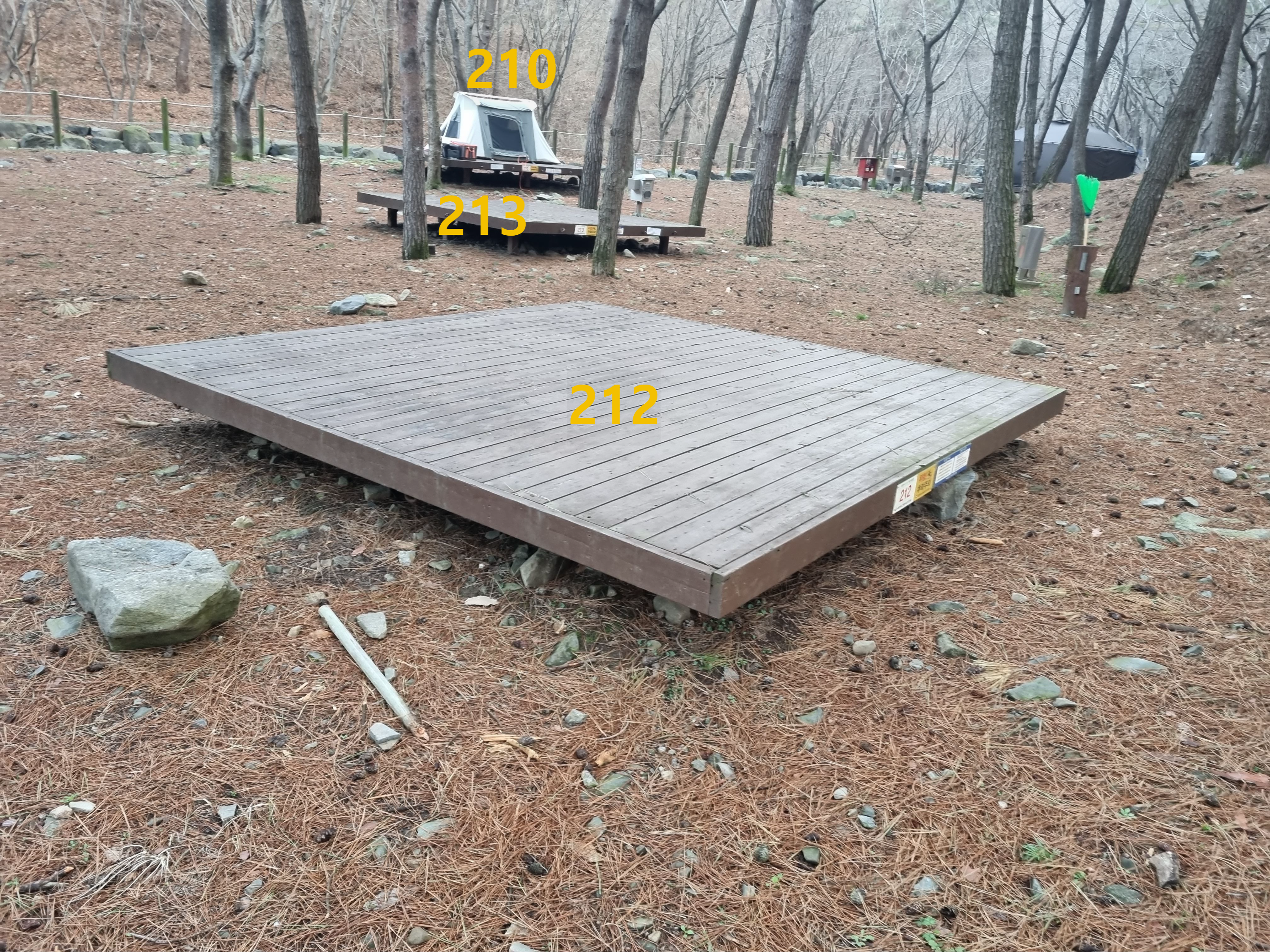 이곳지대는 비교적 데크들이 몰려있는 형태인데요 데크번호가 계곡적으로 시작해서 길가쪽으로 순서가 정해집니다. 211데크가 길가 그뒤로 208데크가 있고 옆으로 212번 입니다.