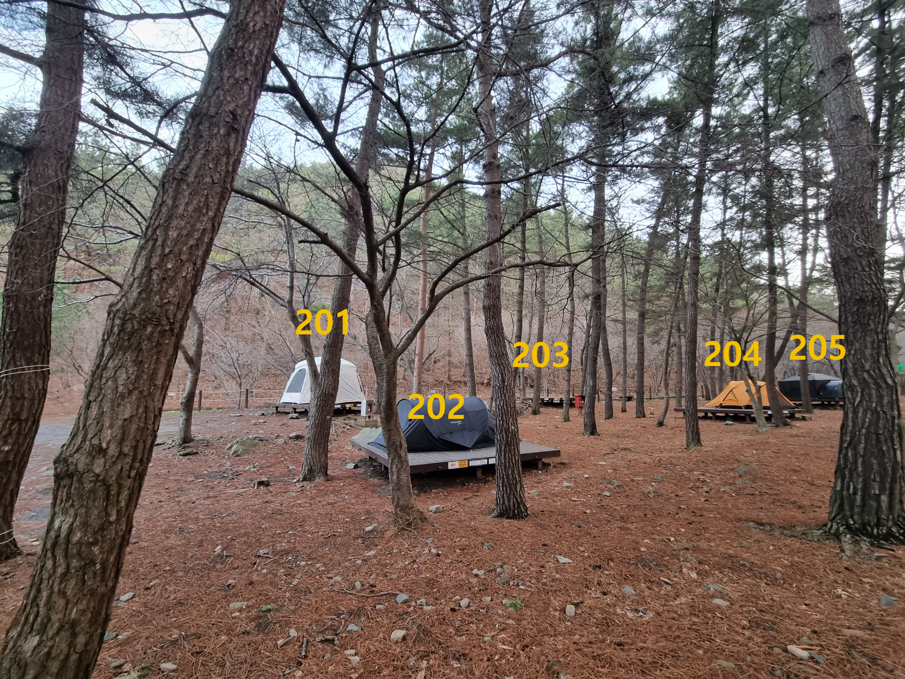 203 (빈데크) 204 (노랑텐트) 205번(검정텐트) 의 데크의 자리모습입니다. 역시나 주변이 넓어서 좋습니다.