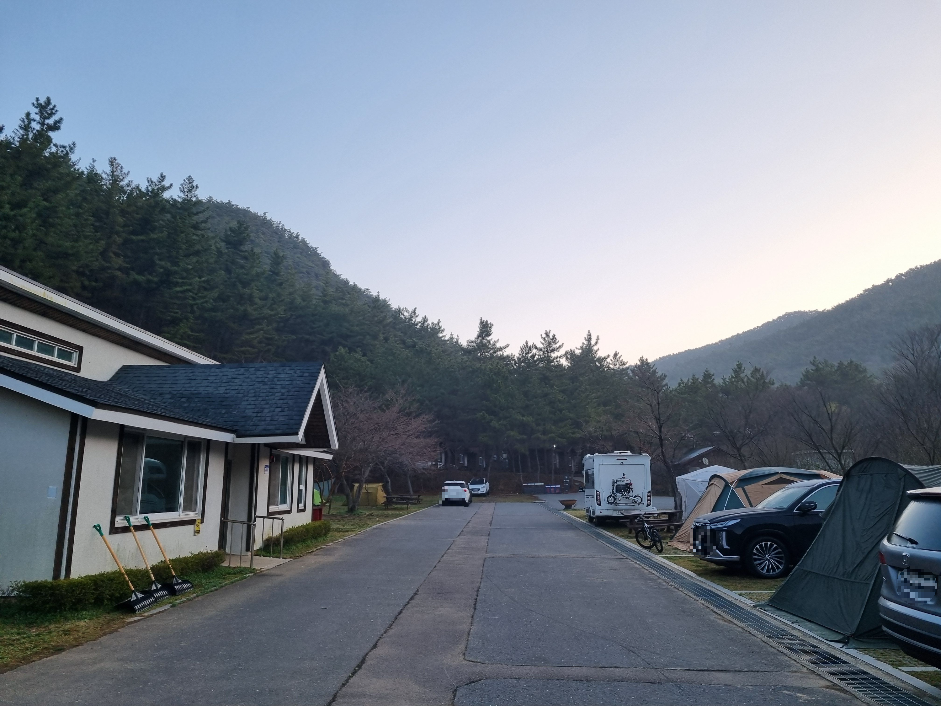 반대편 산쪽으로 희리산자연휴양림 1야영장 사이트를 보겠습니다. 역시나 6개가 자리하고 있고 취사장등이 있는 캠핑센터 건물좌우로 각 3곳이 자리하고 있습니다.