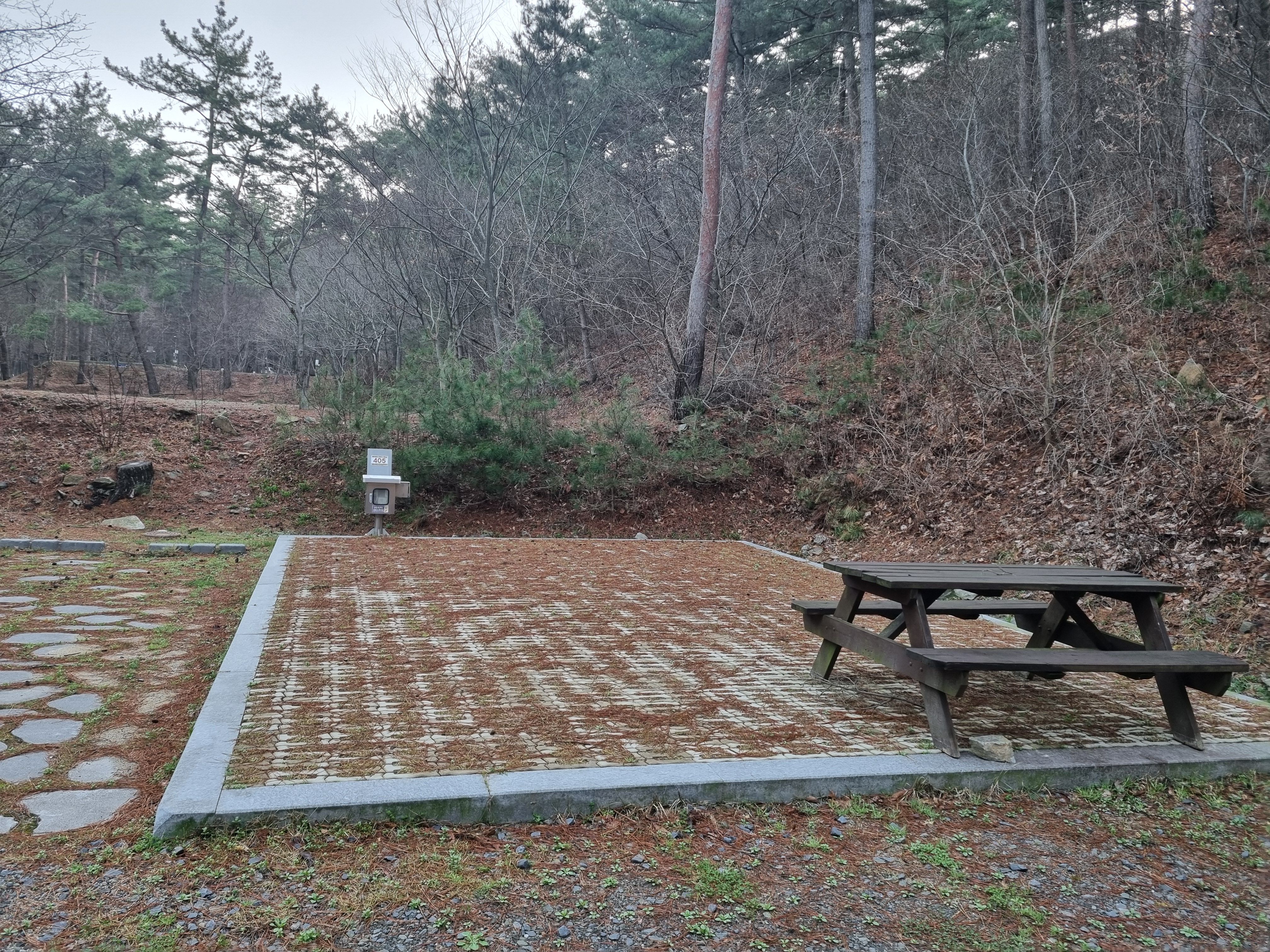 희리산 4야영장 들어가는 입구 인데요, 길에서 얼마 들어가지않고 2단으로 구성된 사이트로 차를 주차할 수있는 박석이 깔린사이트와 벽돌이깔린 데크 형태로 되어있고 사이트마다 테이블도 있습니다.