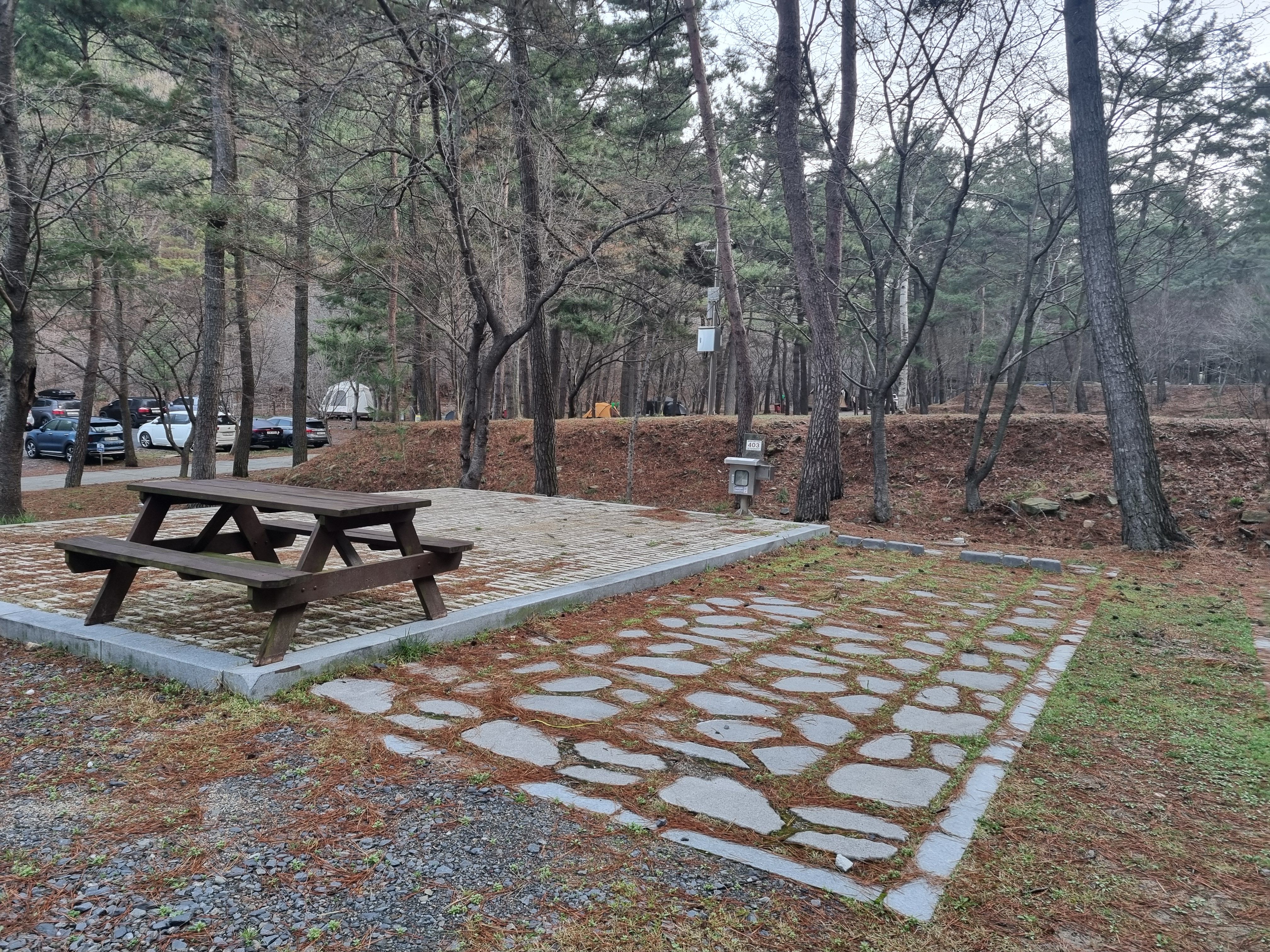 좌측 405번 옆이고 401번 위 사이트인 403번 데크의 모습입니다. 데크공간에는 벽돌이 깔려있어서 팩을 박기에는 불편함이 있으니 좀 더 긴 스트링을 준비 하시기 바랍니다. 주차공간에 텐트를 구축하고 데크쪽에 타프를 설치하는분들도 많죠.