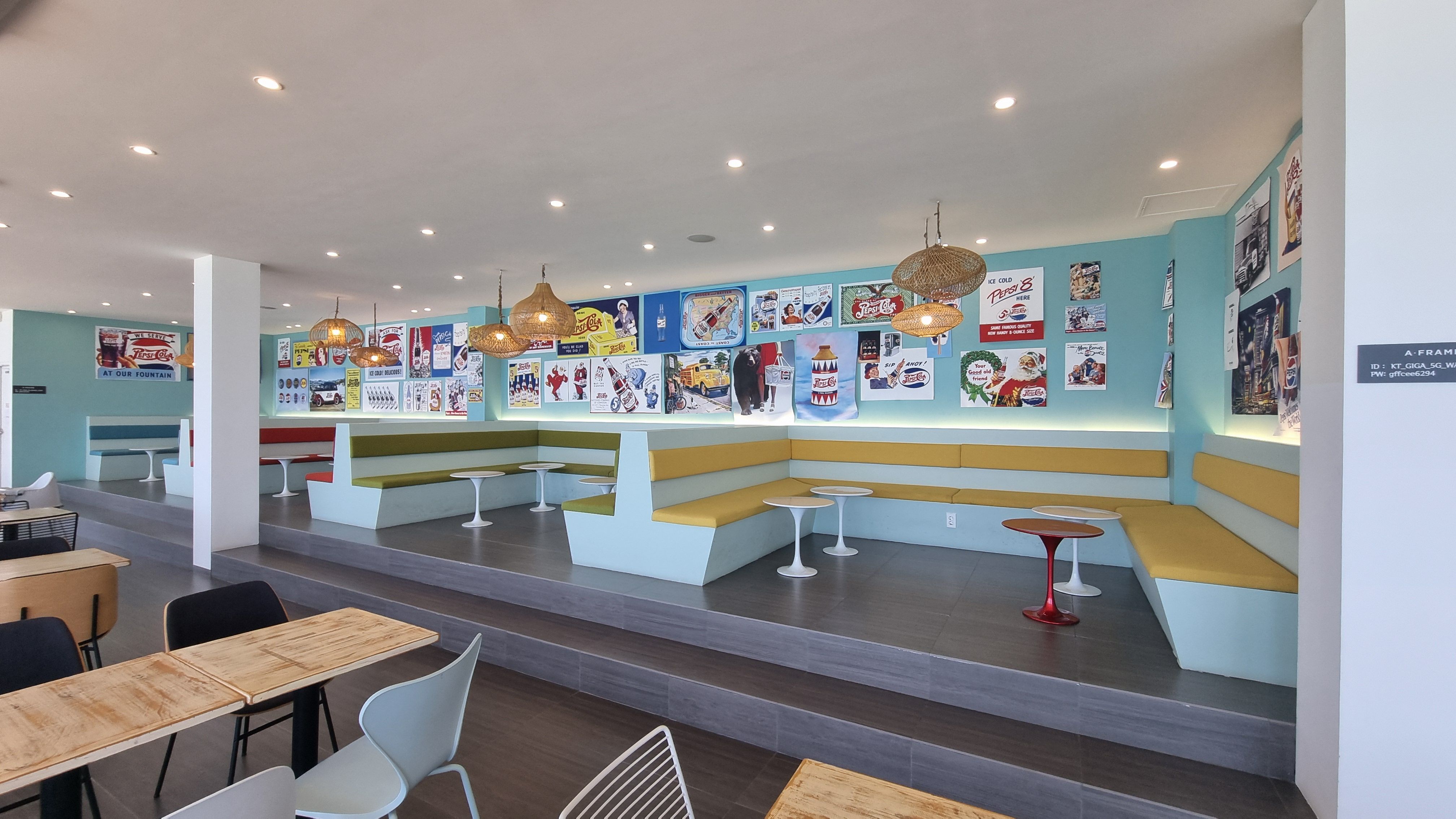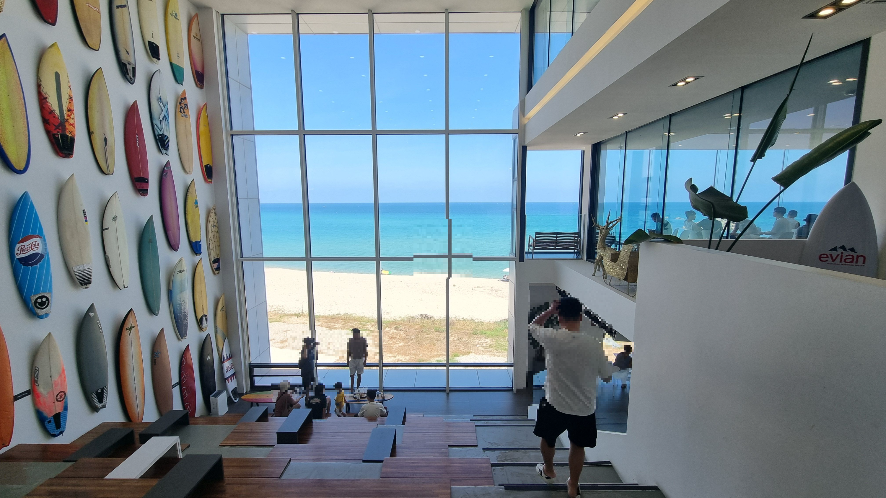 고성 에이프레임 카페를 대표하는 시그니처 장소, 계단식으로 된 테이블에 긴창너머로 해변을 감상할 수가 있고 벽면에는 형형색색 서핑보드들이 걸려있는데 이색적이고 사진도 잘 나옵니다.