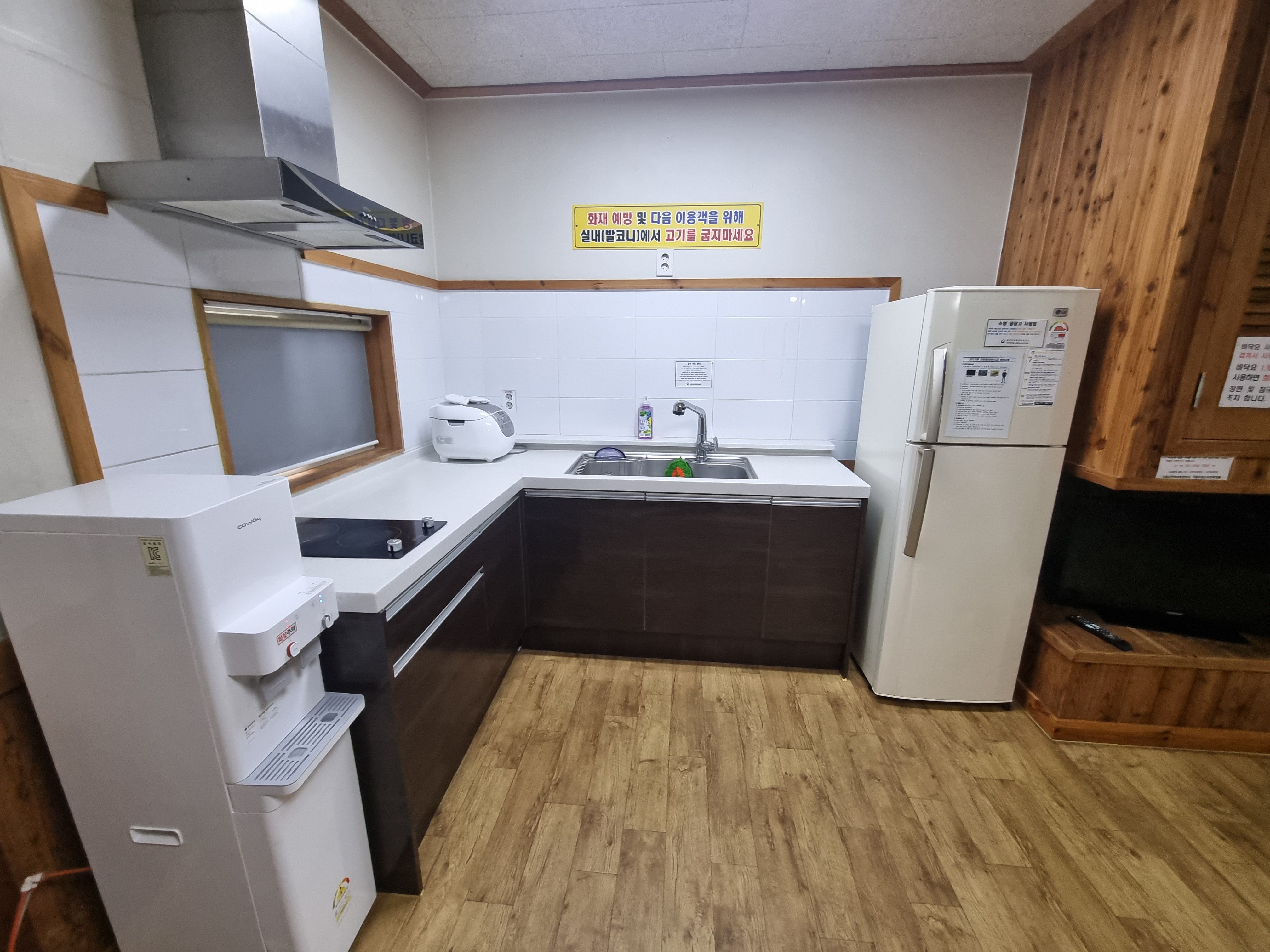 주방은 'ㄱ'형태로 넓어서 여유롭게 사용이 가능한데요, 국립자연휴양림 연립동이나 숲속의집에서는 냄새가 배는 고기를 굽거나 생선등을 요리해 먹으면 안되고 간단한 밀키트 음식이나 요리를 해먹을 수 있기 때문에 기본 에티켓은 지켜주셔야 해요.