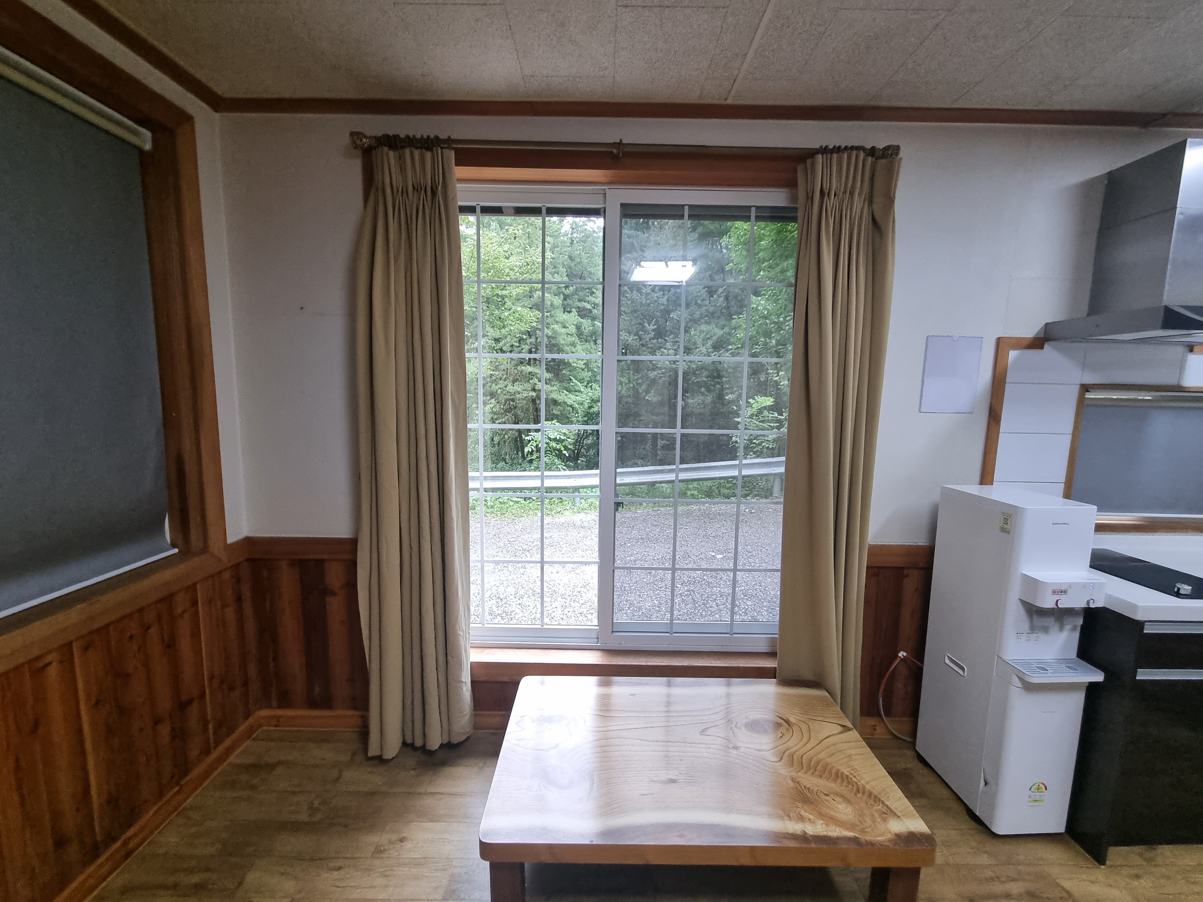 올빼미 호실 내부의 전체 모습입니다. 넓은 거실이 일단 눈에 띄는데요, 유명산자연휴양림 5인실 중에서도 원룸형태가 아니고 작지만 방이 하나 있어서 더 좋은곳입니다.