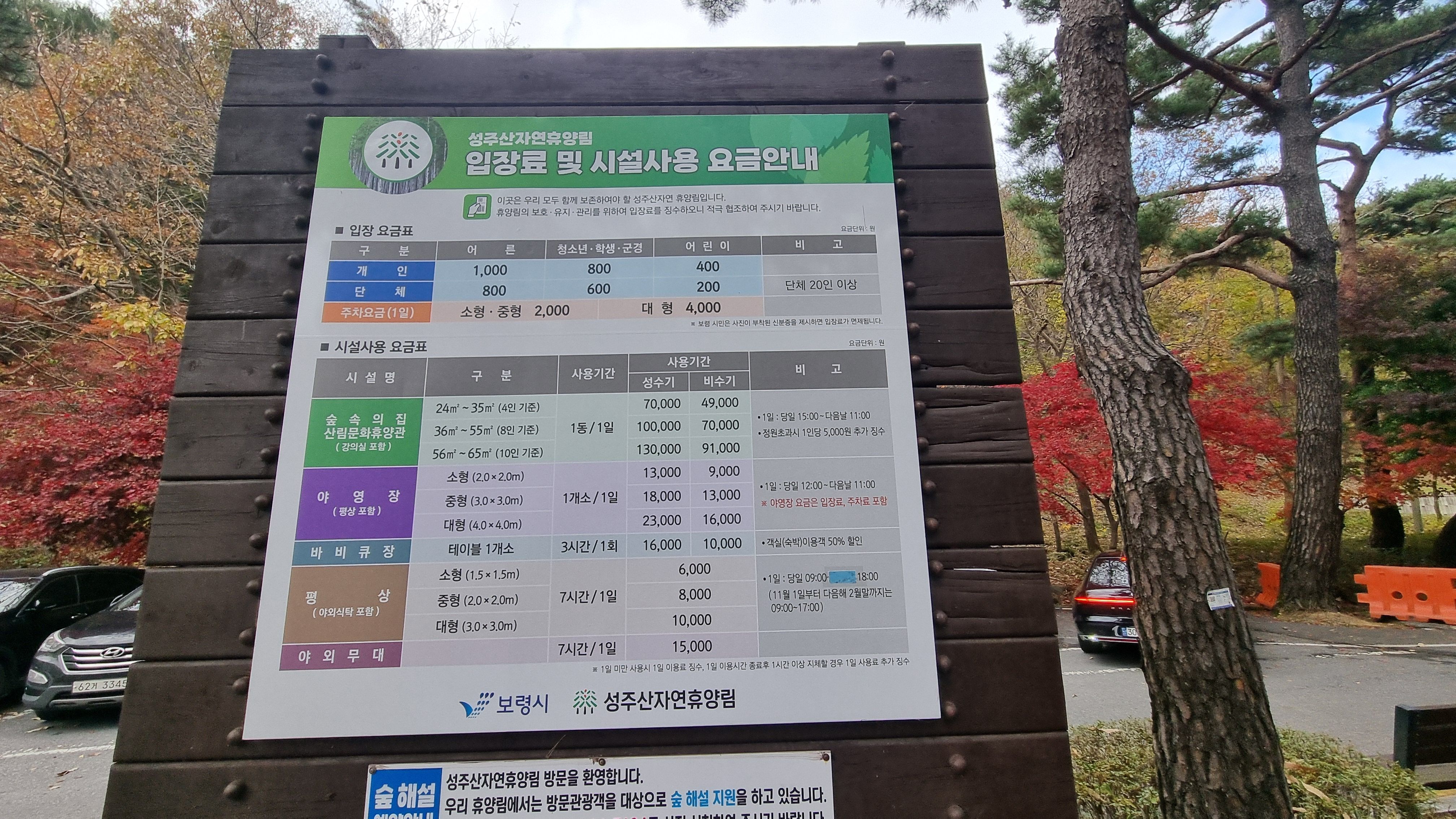 몇년전 성주산자연휴양림 캠핑장으로 가을에 캠핑을 왔었는데 그때 단풍 기억이 너무 좋아서 이번에 대천여행을 오는김에 다시 들렸는데, 당연히 단풍이 다 졌을거라 생각하고 갔지만 뜻밖의 풍경을 맞이했네요. 당일 방문자는 어른기준 입장료1천원, 주차비2천원을 받습니다. 보령시 거주자와 다자녀가구는 무료라니 더 좋겠네요.