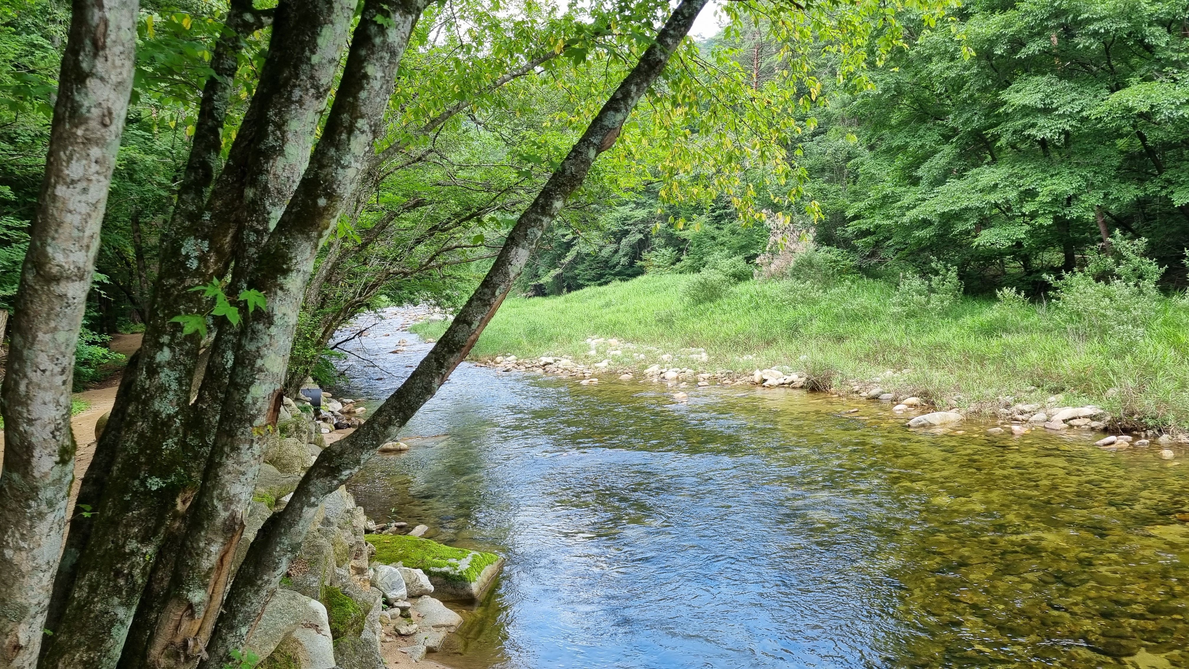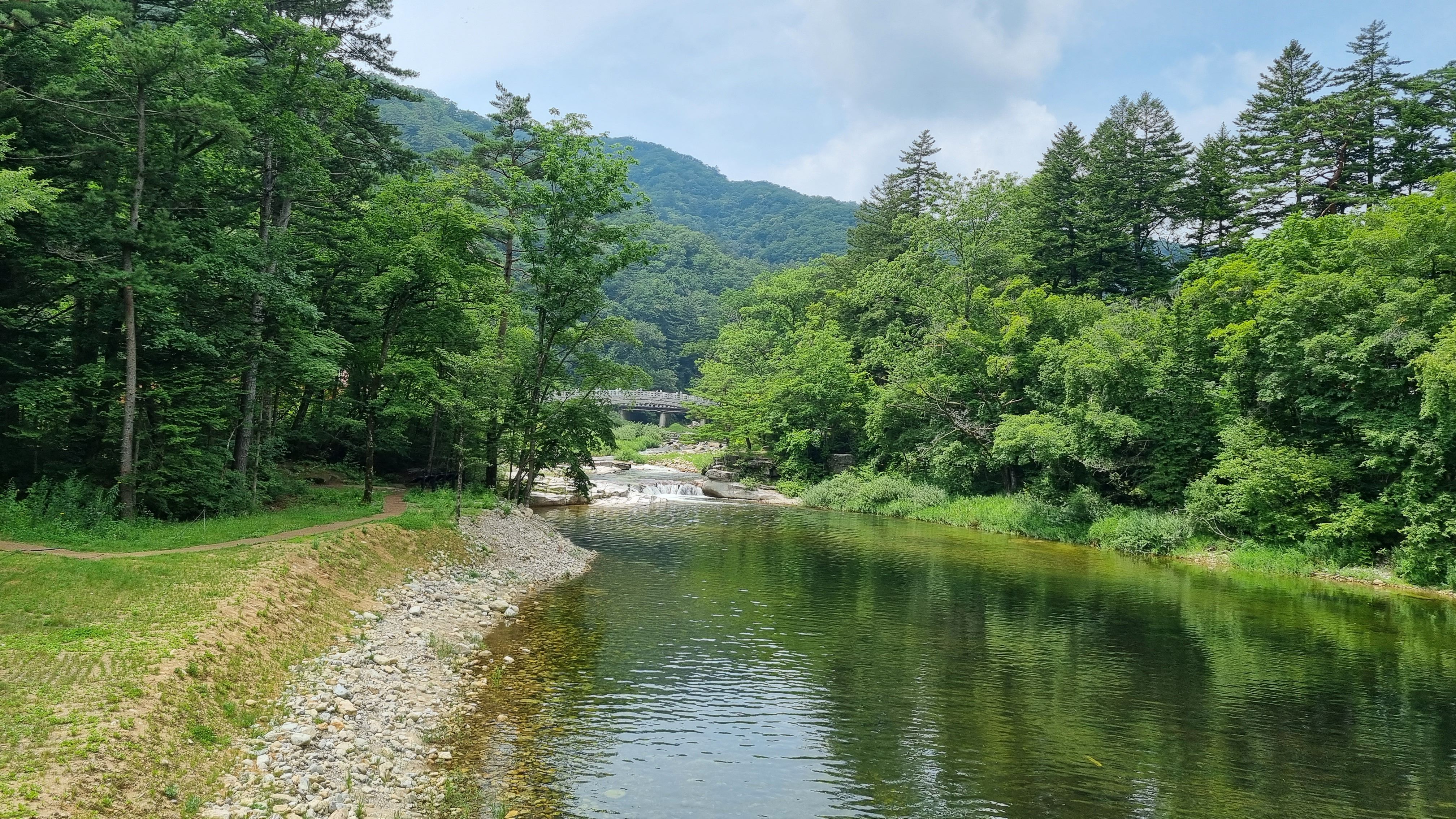 길을 따라 흐르는 계곡물과 징검다리, 목재 데크가 걷는 재미를 더해줍니다.