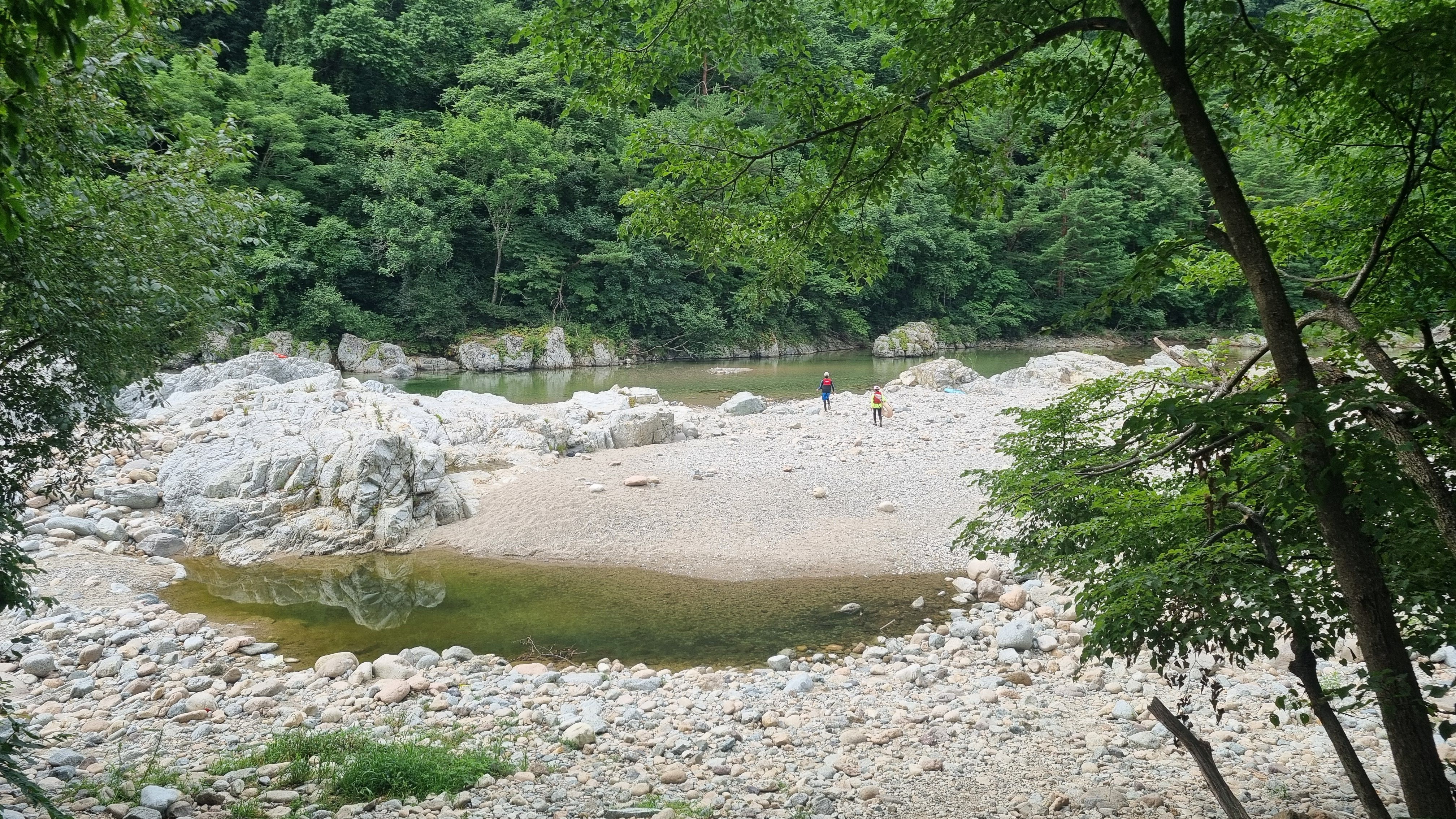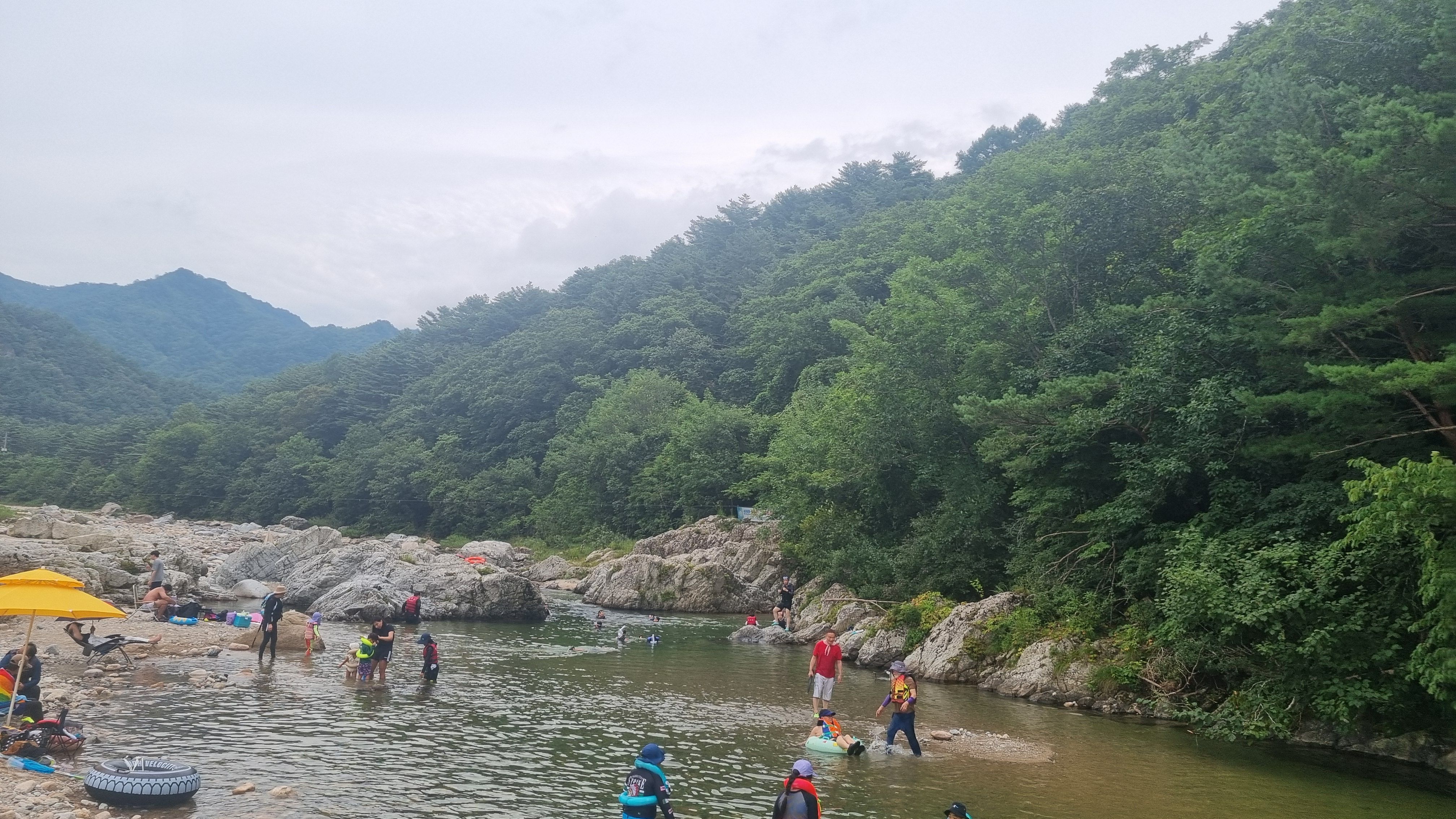 계곡 양쪽은 숲이 울창해서 햇빛을 가려주고, 곳곳에 평평한 자갈 구간이 많아 텐트나 매트 깔기도 좋았습니다. 특히 낮은 수심대와 깊은 다이빙 구역이 구분돼 있어 놀이터처럼 다양한 즐길 거리가 펼쳐지는 느낌이었어요.