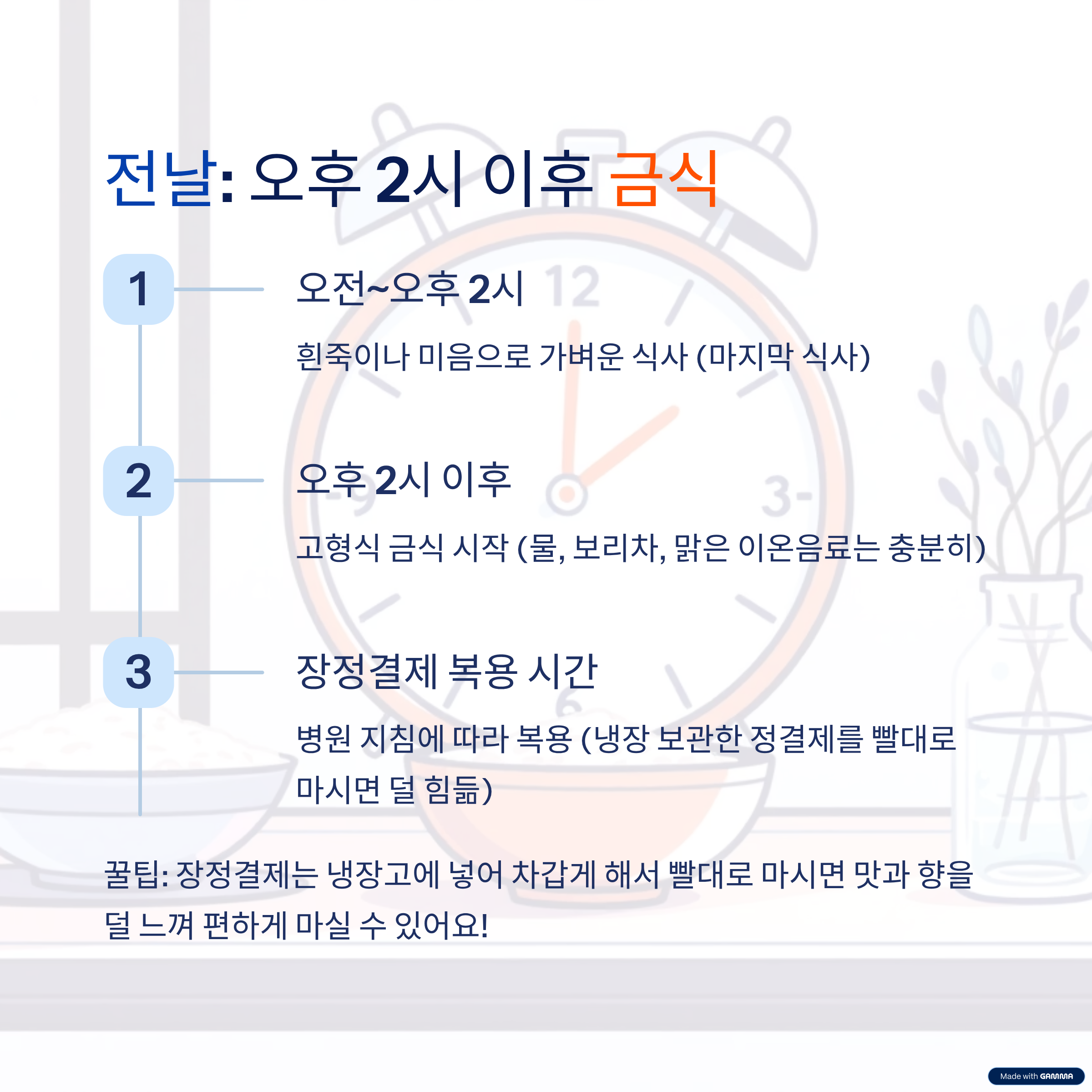 전날: 오후 2시 이후 금식, 수분 보충은 충분히
