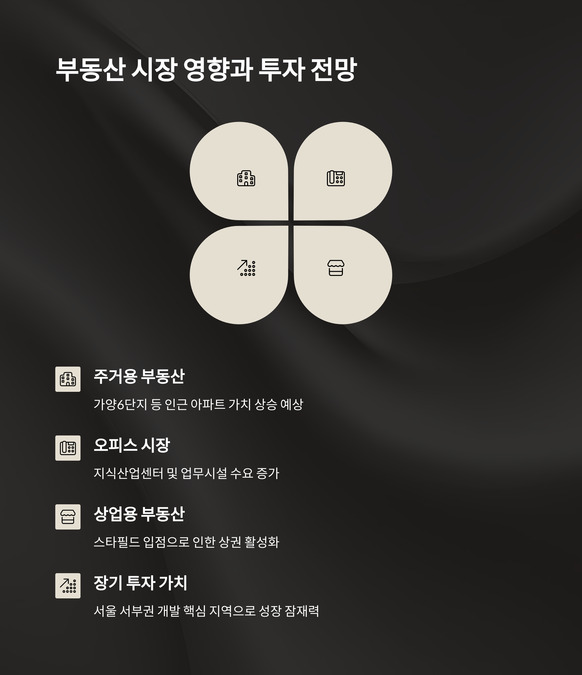 이번 사업은 서울 서부권의 경제적 중심지로 자리잡을 가능성이 크며, 그로 인해 주변 부동산 시장에도 긍정적인 영향을 미칠 것으로 보입니다. 강서구는 마곡지구와의 가까운 위치와 유동인구 증가를 바탕으로 매력적인 투자처로 떠오르고 있으며, 이에 따른 부동산 시장의 활성화가 기대됩니다.