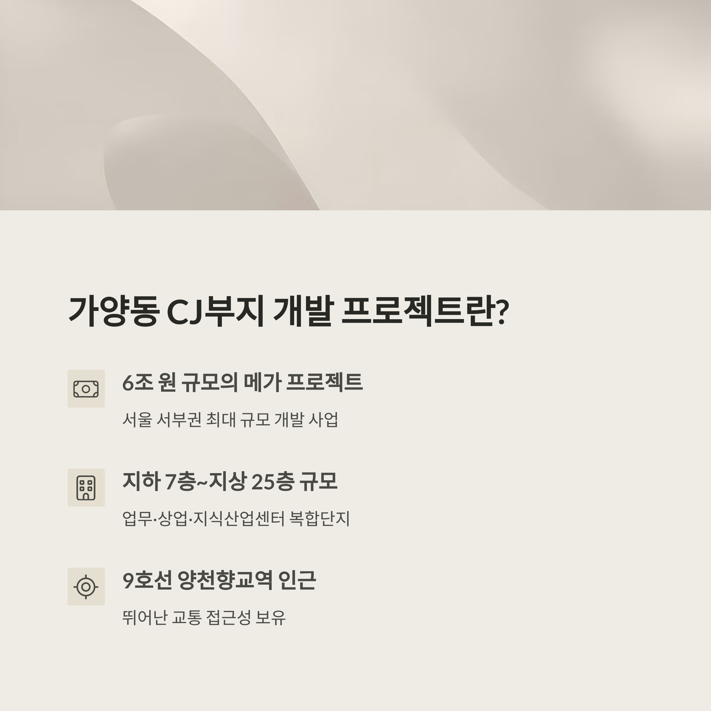 서울 강서구 가양동 CJ공장 부지 개발 사업은 총사업비 6조 원 규모로, 지하철 9호선 양천향교역 인근에 지하 7층~지상 25층 규모의 업무·상업·지식산업센터를 조성하는 프로젝트입니다.