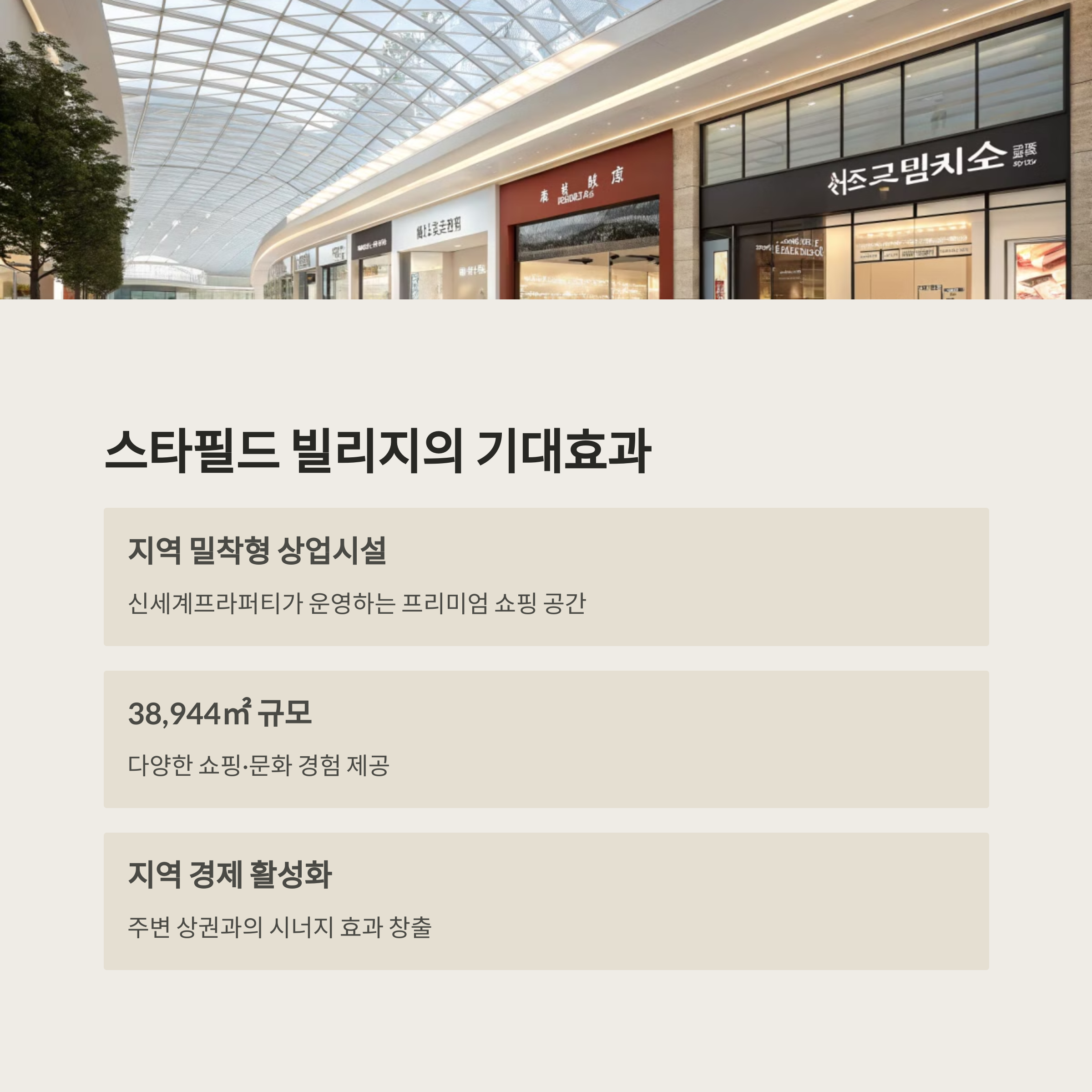 이 중 판매시설 부지에는 신세계프라퍼티가 운영하는 '스타필드 빌리지'가 입점 예정으로, 지역 밀착형 상업시설로 주목받고 있습니다.