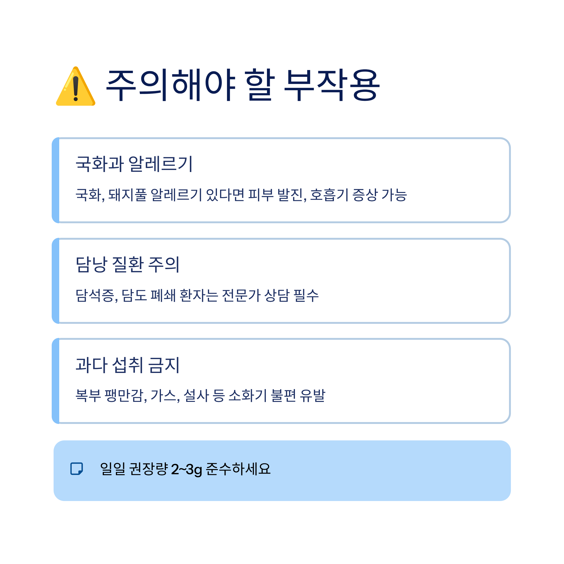 또한, 시나린 성분이 담즙 분비를 과도하게 자극할 수 있어 담석증이나 담도 폐쇄 같은 담낭 질환을 앓고 있는 분들은 전문가의 의견을 먼저 들어보는 것이 필수적입니다.