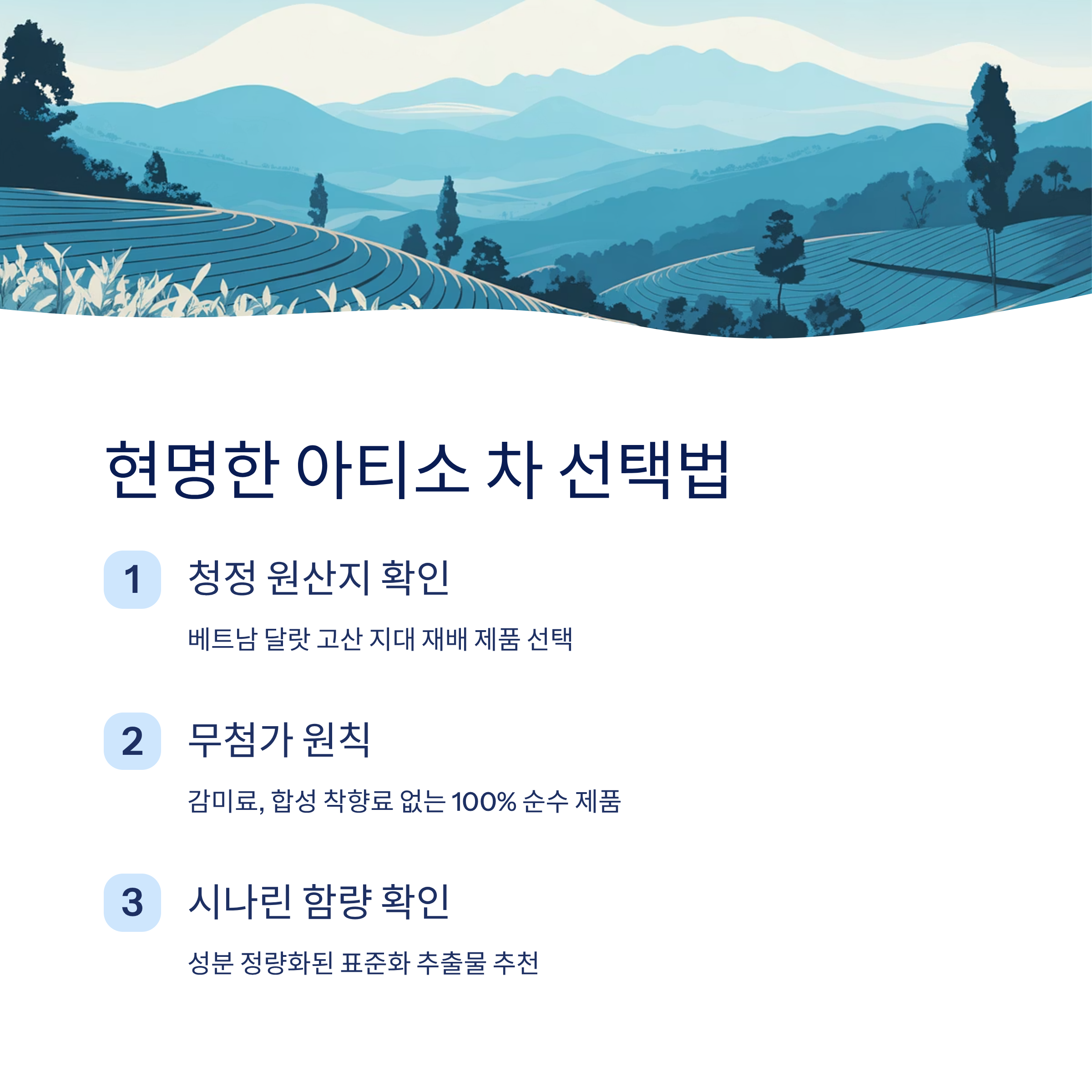 - 원산지의 청정성: 베트남 달랏과 같이 일교차가 크고 고산 지대인 곳에서 자란 아티소는 성분 함량이 높다고 평가받습니다. 원산지를 명확히 확인하세요.