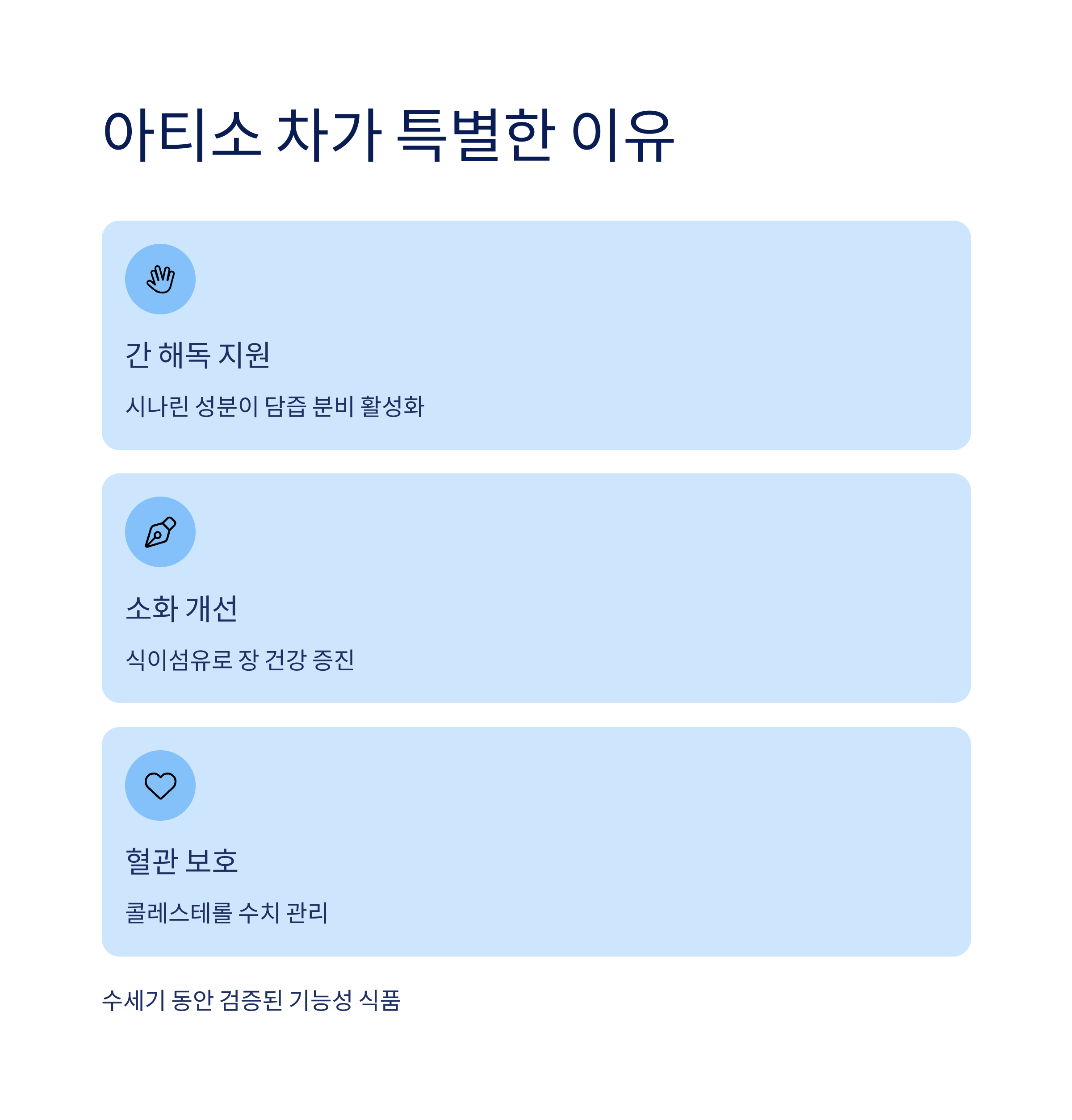 아티소 차 효능을 제대로 경험하고 싶다면, 꾸준히 물처럼 마시면서 장 운동을 도와보세요. 소화가 편안해지면 일상의 질이 정말 달라질 거예요.