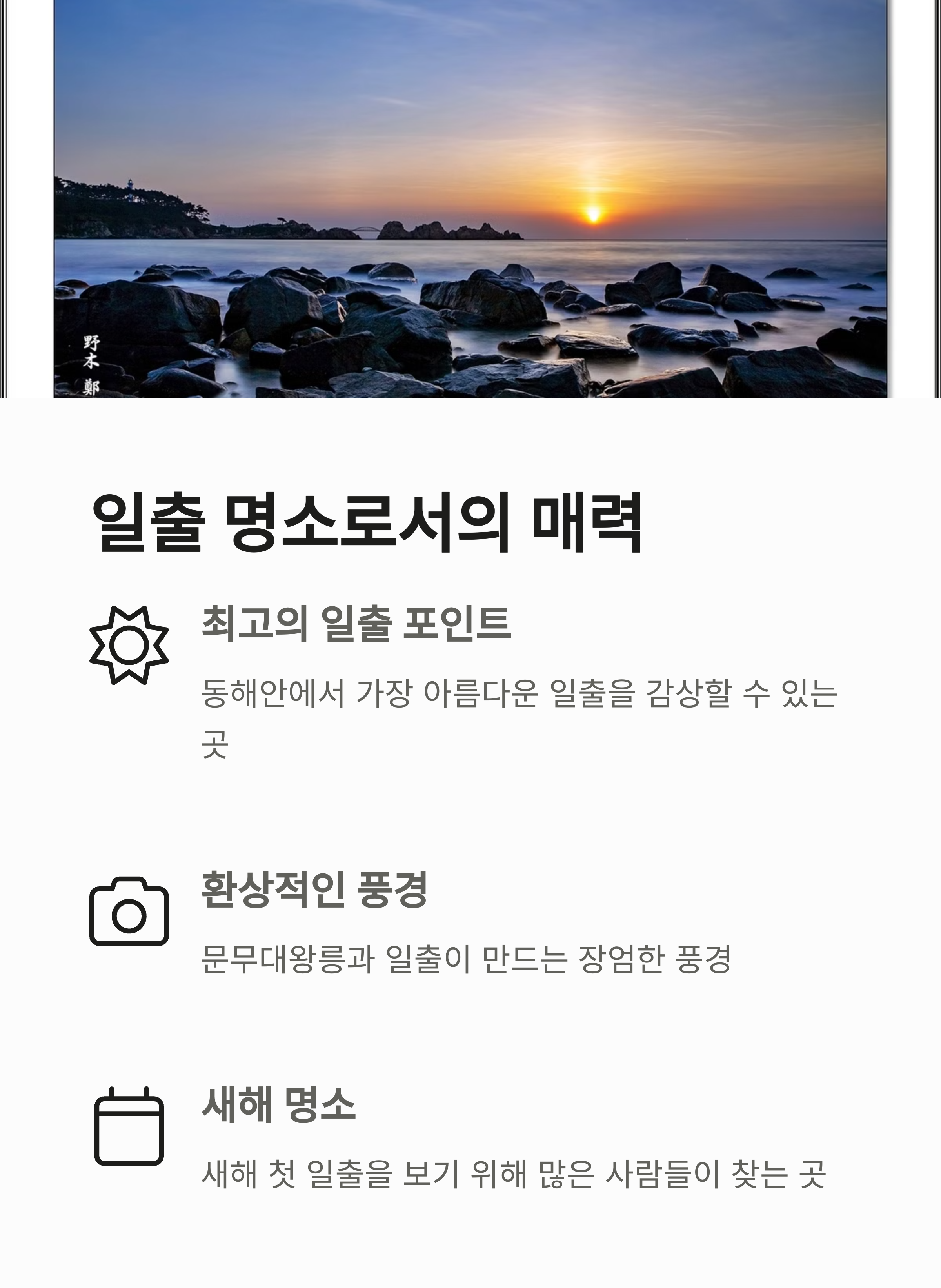 매년 이곳에서 이루어지는 일출은 그 자체로도 유명하며, 동해의 푸른 바다와 물보라를 동시에 즐길 수 있는 특별한 장소입니다. 해변에서 만나는 문무대왕릉은 삼국 통일을 이룬 문무왕의 수중릉으로, 역사적인 가치를 더해주고 있습니다.