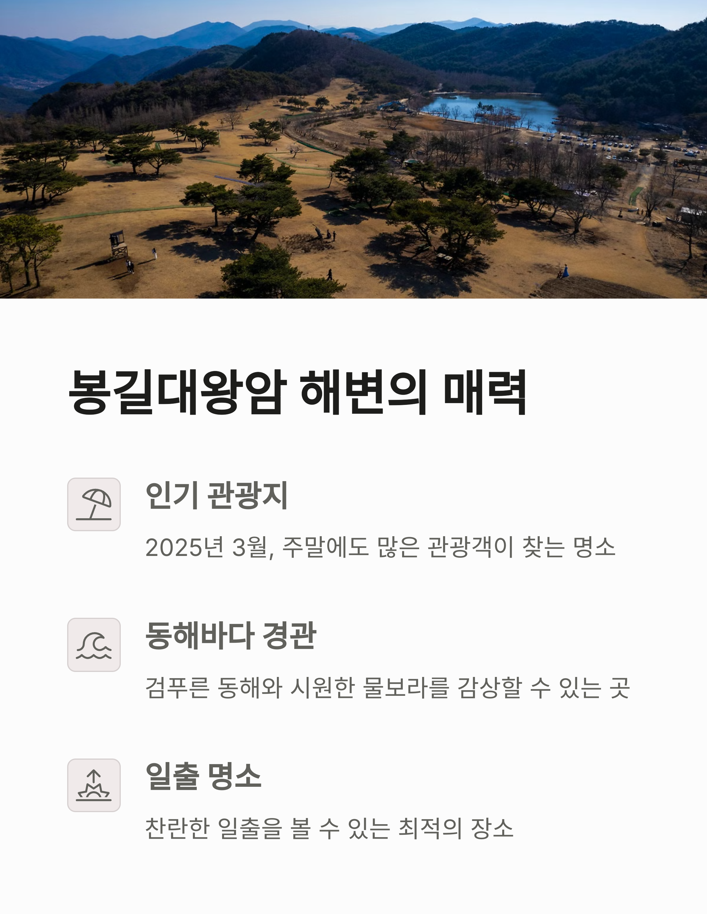 봉길대왕암 해변에서는 검푸른 동해바다를 감상하며 일출을 즐길 수 있으며, 해변의 몽돌과 모래가 공존하는 독특한 지형을 경험할 수 있습니다. 또한 바닷물이 드나드는 소리를 들으며 여유로운 시간을 보낼 수 있습니다.