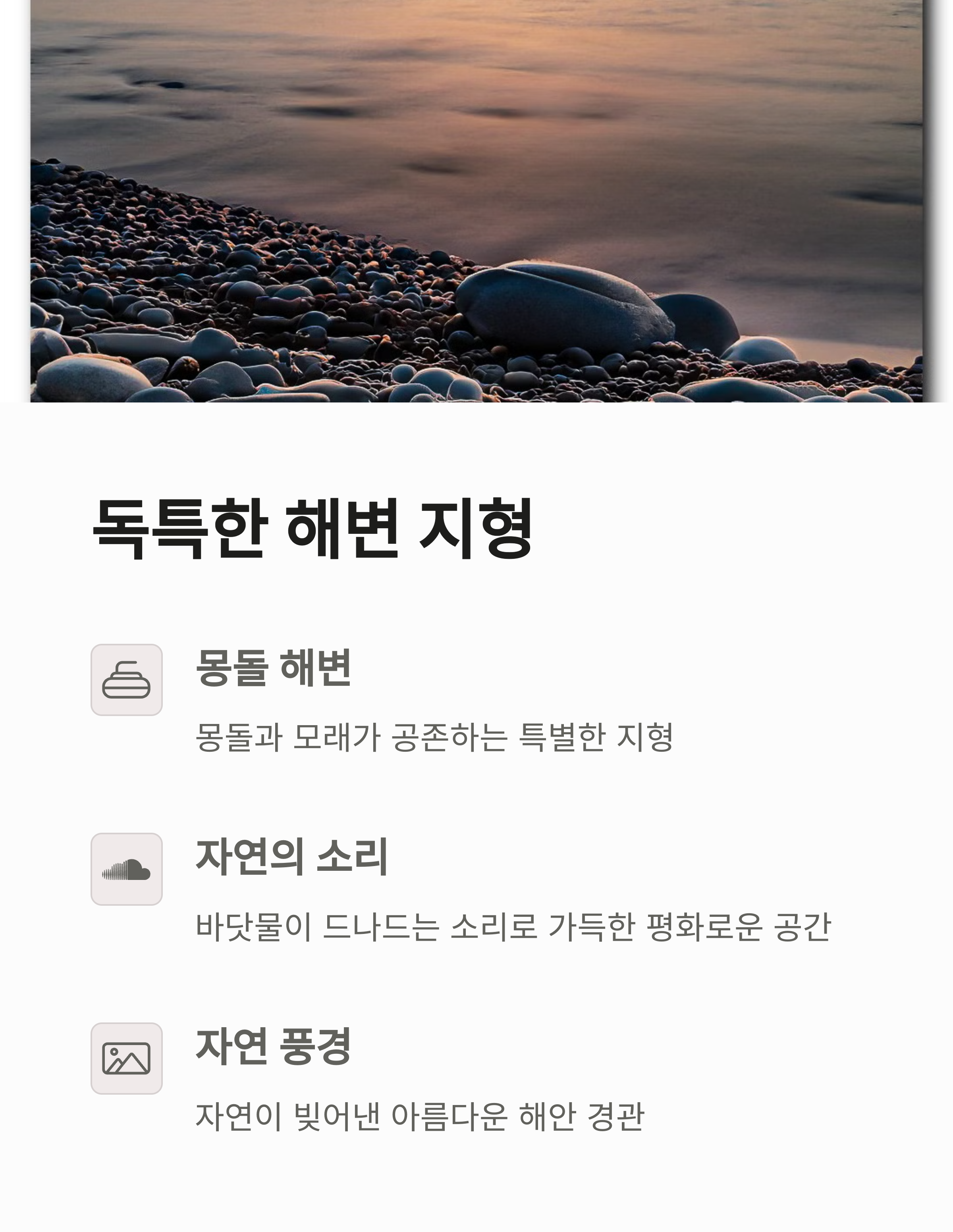 이 해변은 몽돌과 모래가 공존하는 독특한 지형을 자랑합니다. 해변을 따라 걷다 보면 바닷물이 드나드는 소리가 귀를 간지럽히며, 그 소리 속에서 여유로운 시간을 보낼 수 있습니다. 특히 아침 일출을 맞이할 때는 해변의 평온함과 동해의 아름다움이 어우러져 마음을 차분하게 합니다. 또한, 인근의 양남 주상절리감포 용굴도 꼭 방문해볼 만한 명소로, 그 경이로운 자연의 모습은 많은 이들에게 인상 깊은 기억을 남깁니다.