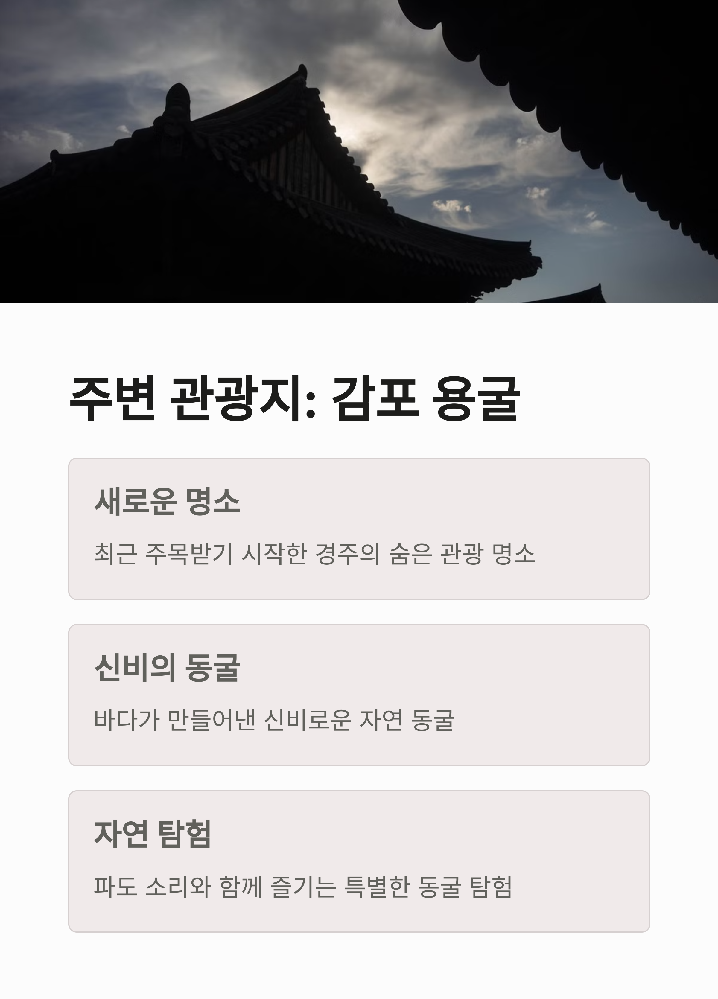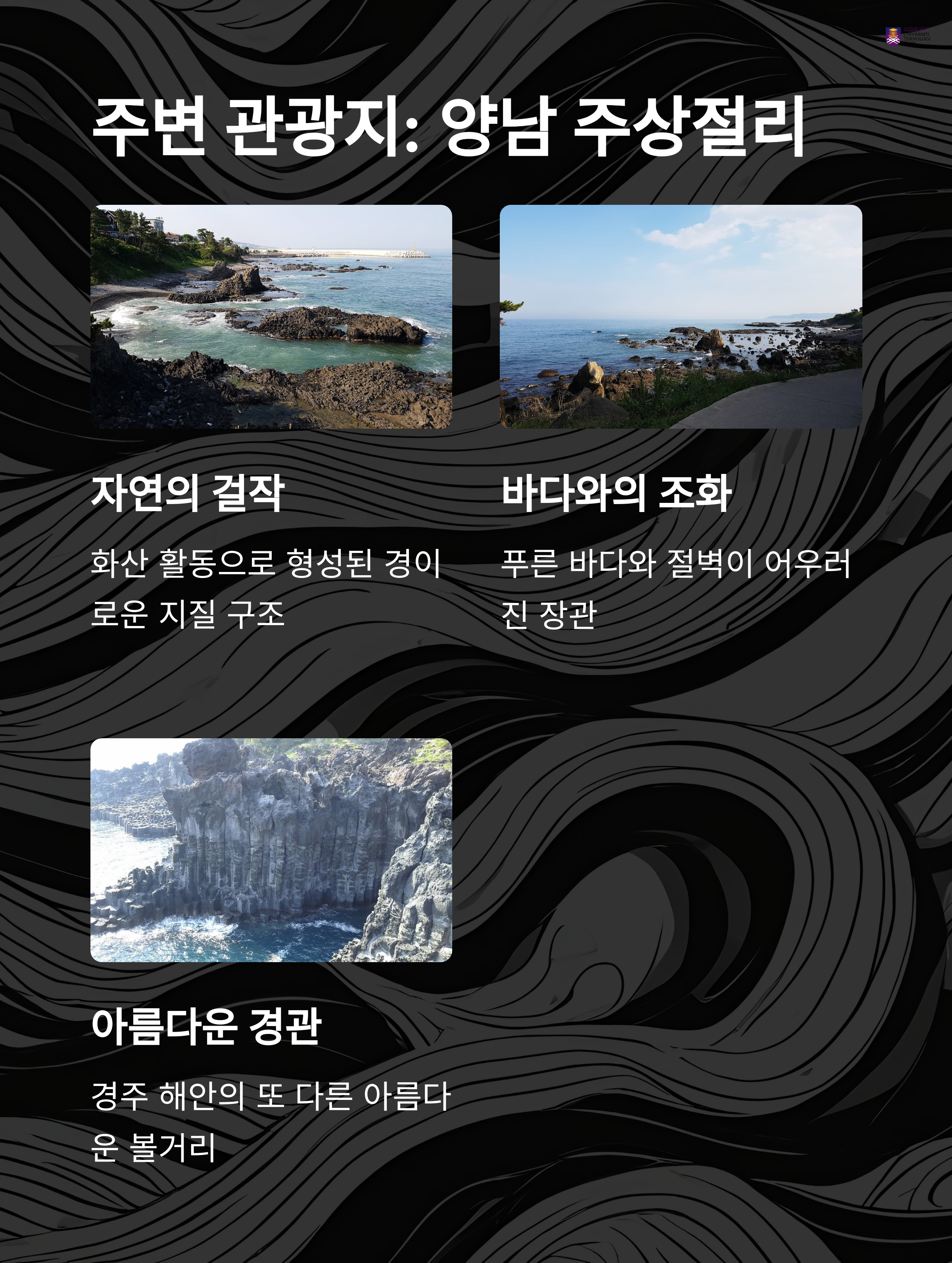 경주 바다 여행에서는 문무대왕릉 외에도 양남 주상절리감포 용굴을 추천합니다. 이들 명소는 그 독특한 자연경관으로 많은 관광객들에게 인기를 끌고 있으며, 경주의 다양한 매력을 한껏 느낄 수 있는 곳입니다.