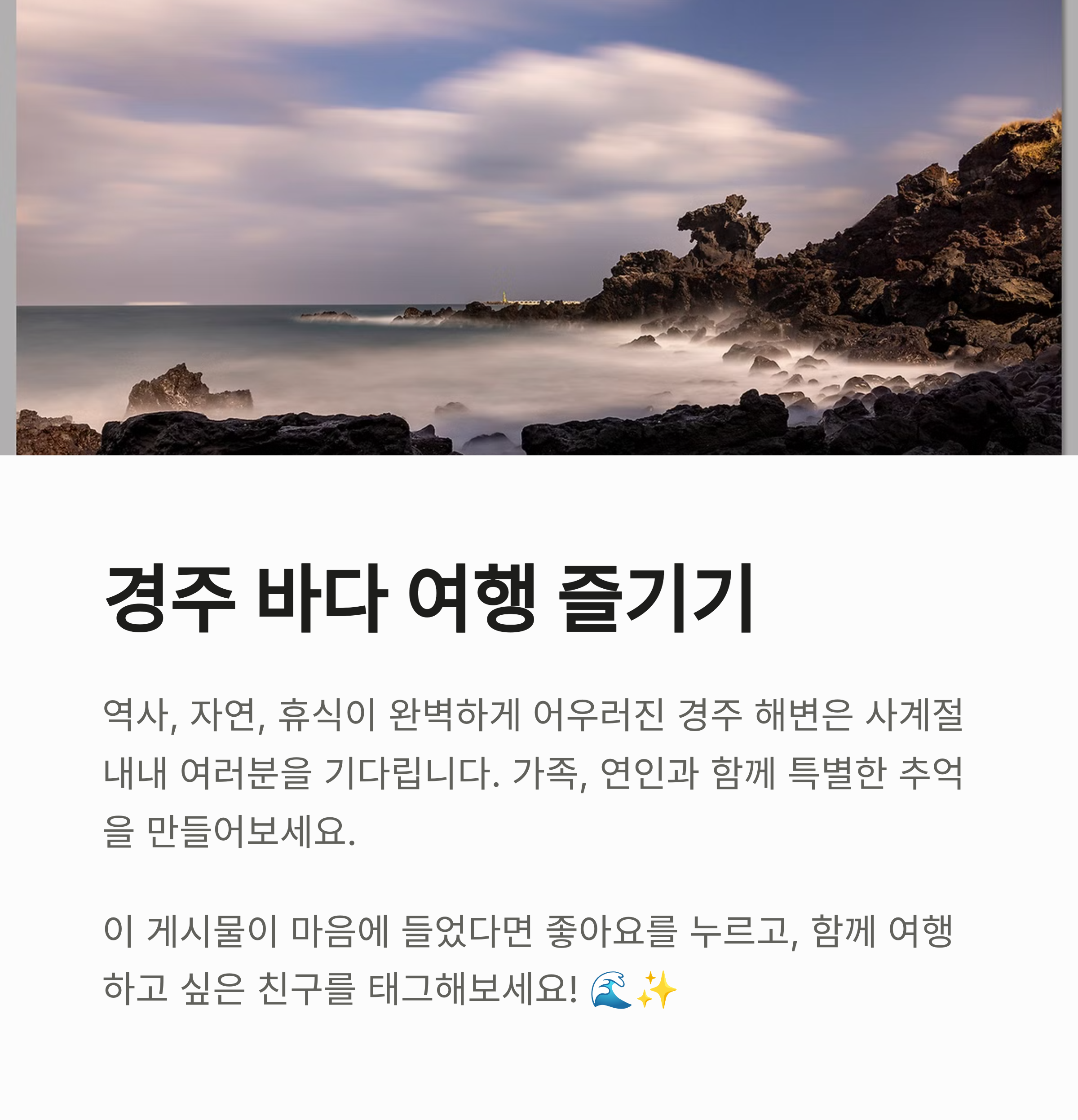 경주 바다는 그 자체로 매력적인 여행지입니다. 문무대왕릉과 봉길대왕암 해변, 그리고 양남 주상절리와 감포 용굴 등 다양한 관광지가 가득한 이곳은 역사와 자연을 동시에 즐길 수 있는 특별한 장소입니다. 이 곳에서의 여유로운 하루를 보내며 경주의 매력을 마음껏 느껴보세요.