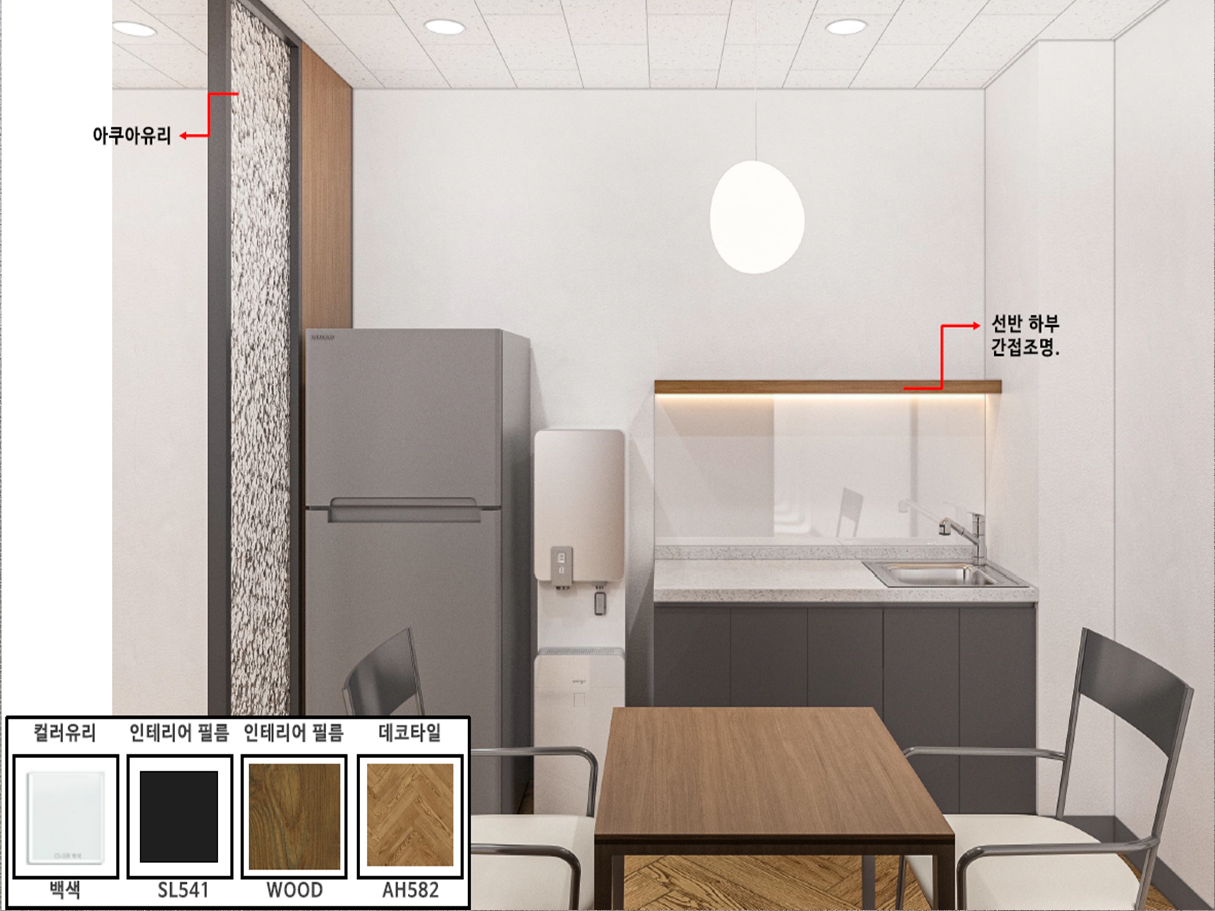 탕비실 또한 싸구려 싱크대 하나 달랑 놓인 형태가 아닌 실제 휴게시설 겸용으로 활용가능할 정도의 럭셔리한 형태로 제공합니다.