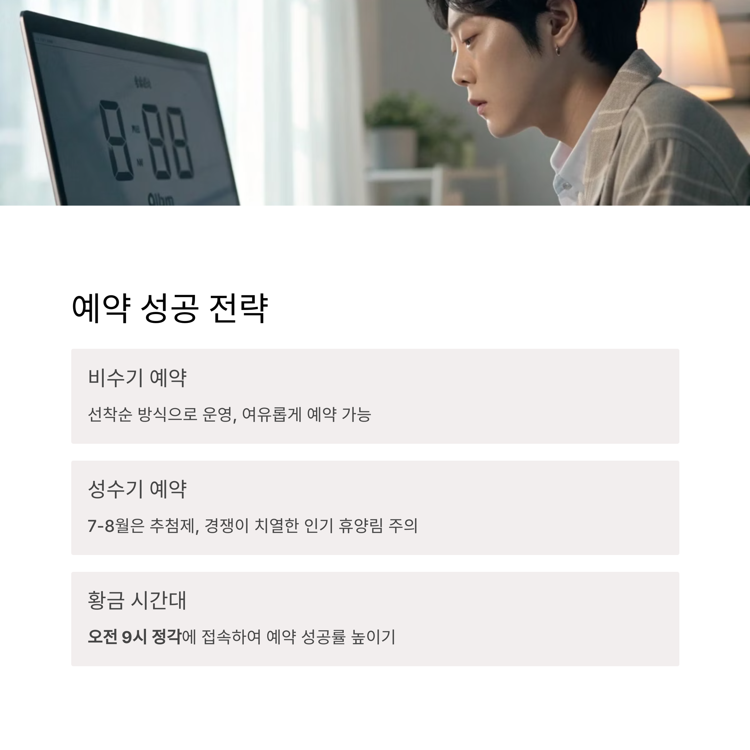 | 성수기 예약 방식 | 7~8월은 추첨제로 운영되며, 신청 후 당첨 결과를 확인합니다. |