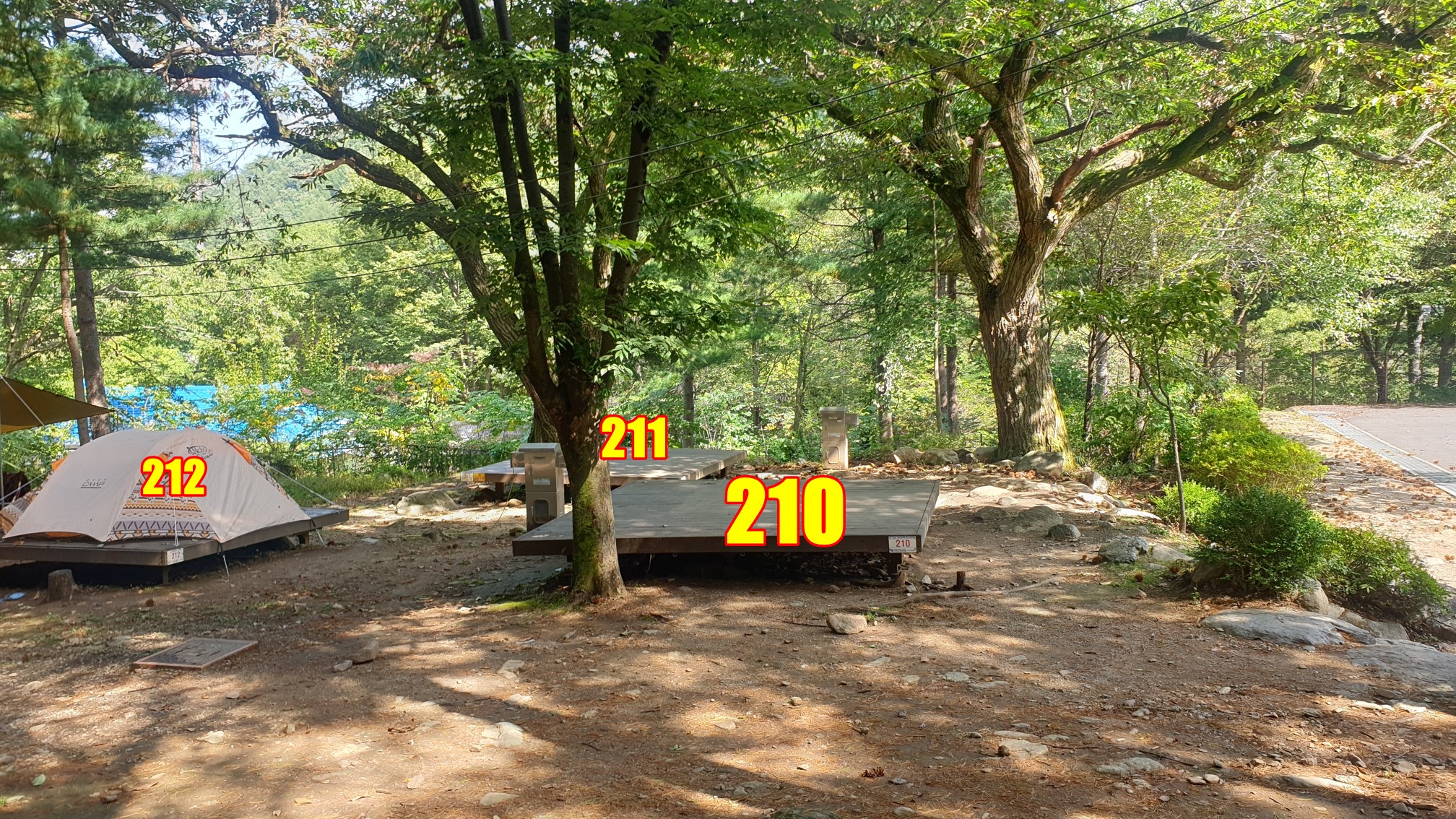 210번,211번, 212번데크는 밤나무와 느티나무 사이에 위치한곳으로 위쪽 데크들과 분리되어 있는곳이고 주차장과 가까워서 좋습니다. 가족단위로 오면 함께 예약하면 편리한곳이죠. 다만, 함께 하더라도 캠핑장매너는 지켜주세요.