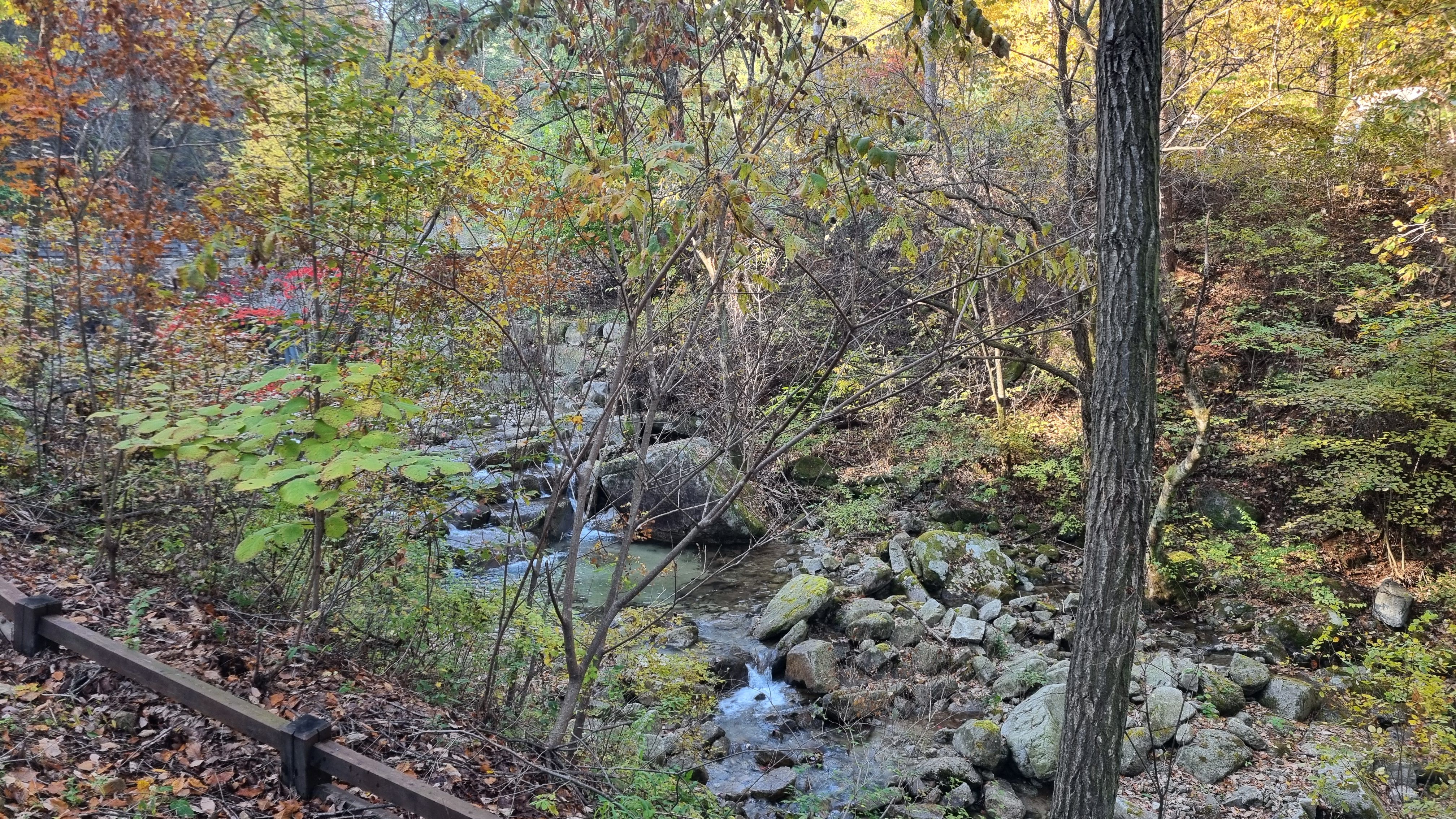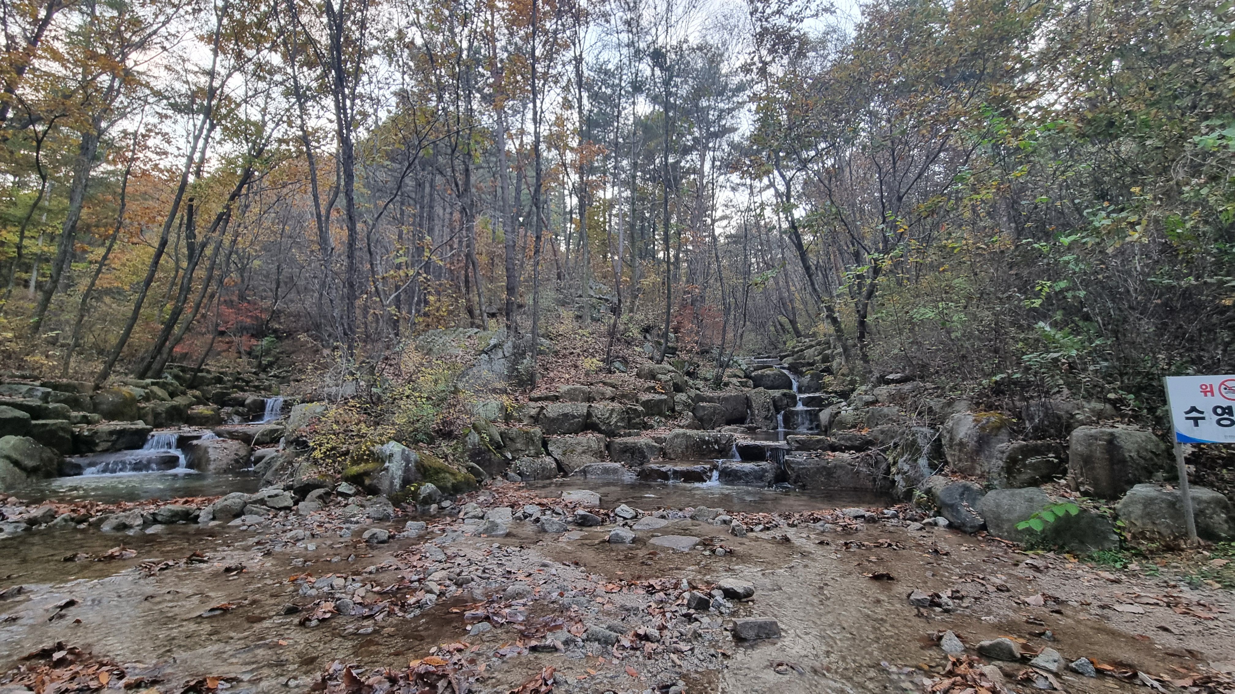가을이지만 여전히 수량이 풍부한데요, 여름철에는 어린아이들은 물놀이를 할 수있을만큼 계곡물이 흐록 작은 웅덩이라서 안전해서 상단 사이트들이 캠핑센터에서 좀 멀고 경사가 있지만 인기가 있는 이유입니다.