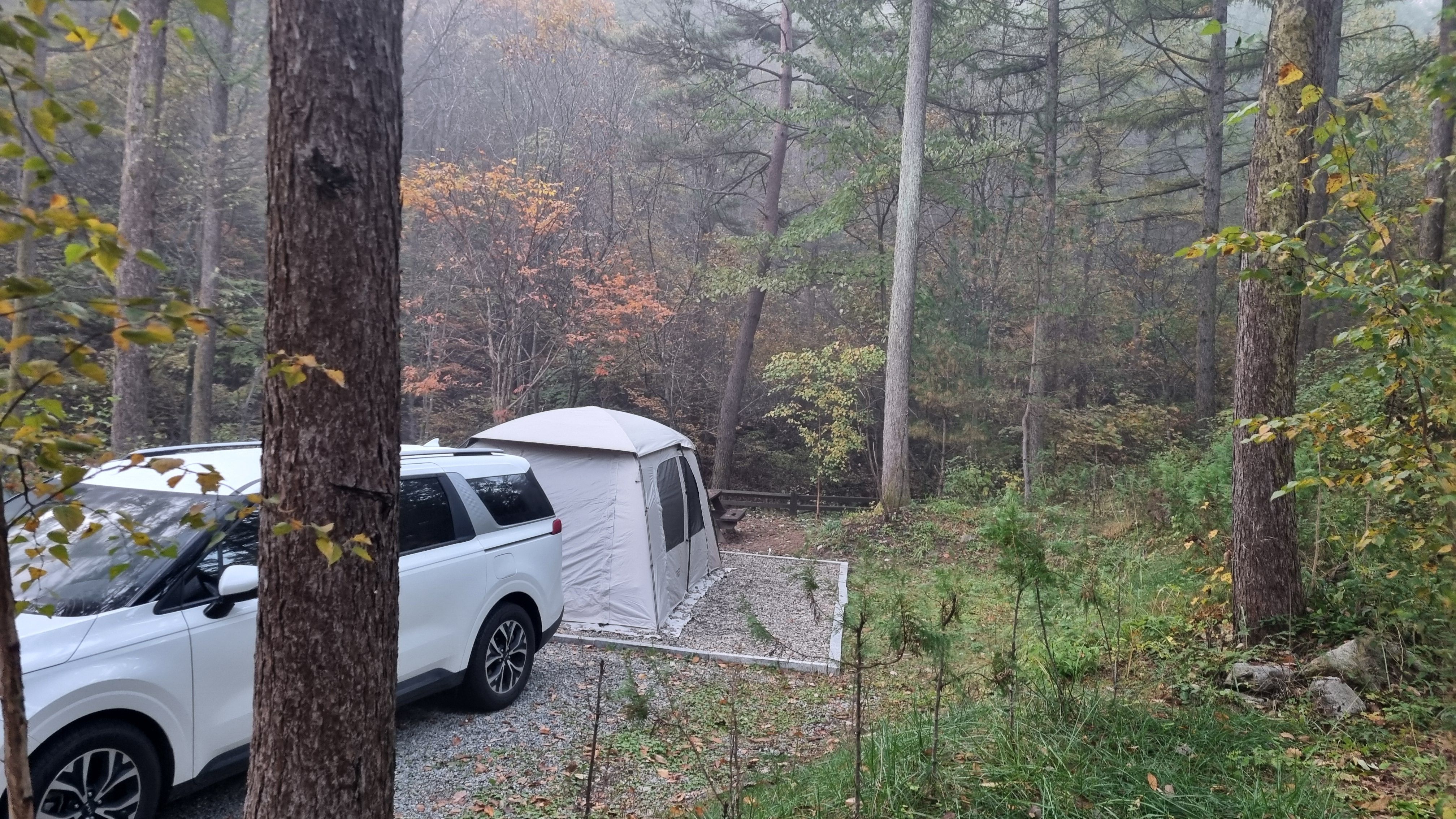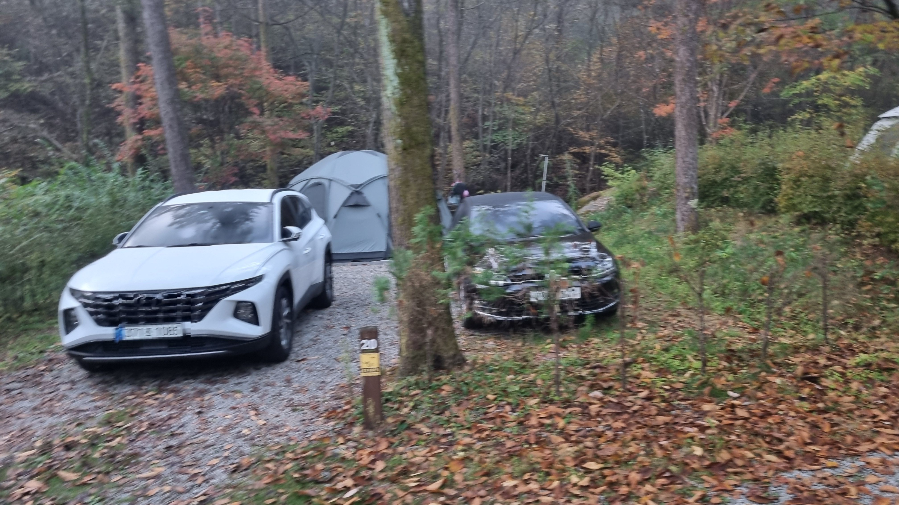화천휴양림 제2 캠핑장에 20번 입니다. 차량2대 충분히 주차가능하고 1대 주차하면 동계시즌에는 쉘터를 설치하면 좋겠네요.