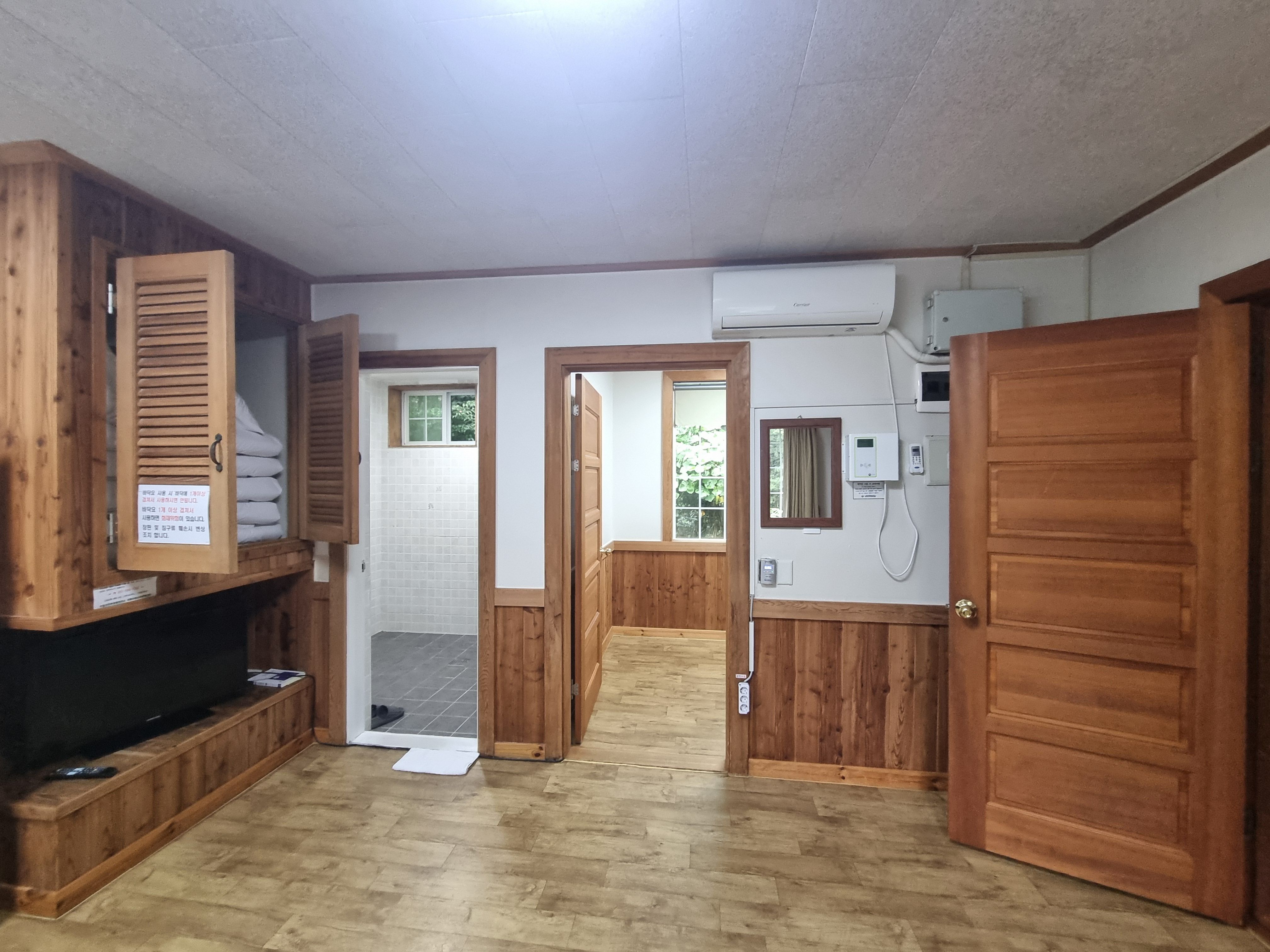 - 객실 특징: 독립형 통나무집 또는 산장 스타일로 자연 친화적이며, 각 동마다 피크닉 테이블이 설치되어 있어 바깥에서 식사하거나 휴식을 취하기 좋습니다. 계곡과 가까워 경치와 자연 소음을 동시에 즐길 수 있습니다. 내부는 다소 노후되었으나, 침구류, 주방용품, 정수기 등 기본 집기류는 잘 갖추어져 있습니다. 일부 객실에는 다락방이 있어 아이들에게 인기가 많습니다.
