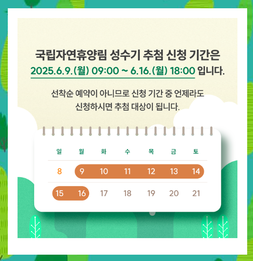 - 성수기 추첨: 2025년 6월 10일 09:00 ~ 6월 17일 18:00 (성수기: 7월 15일 ~ 8월 24일)