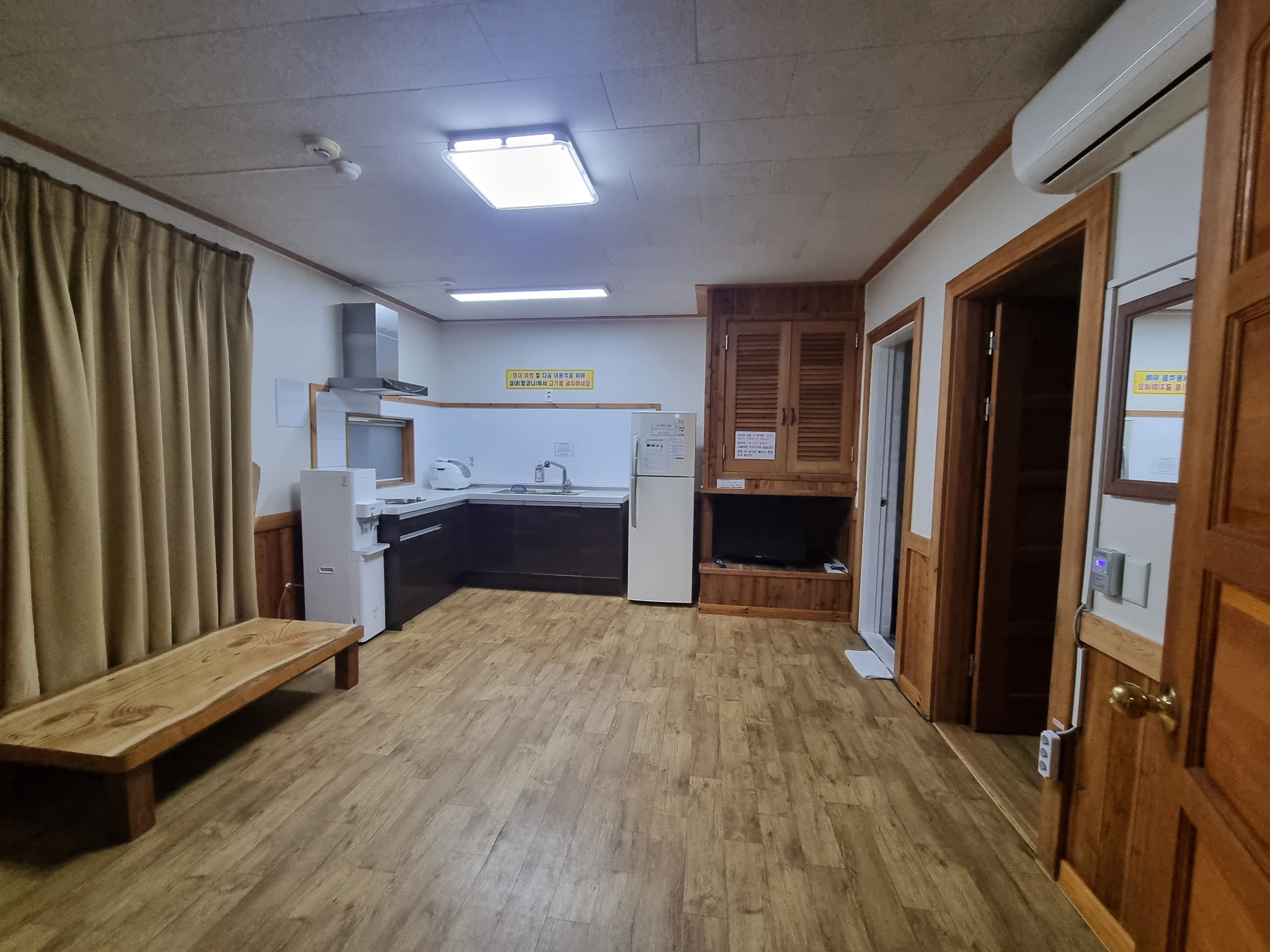 올빼미 호실 내부의 전체 모습입니다. 넓은 거실이 일단 눈에 띄는데요, 유명산자연휴양림 5인실 중에서도 원룸형태가 아니고 작지만 방이 하나 있어서 더 좋은곳입니다.