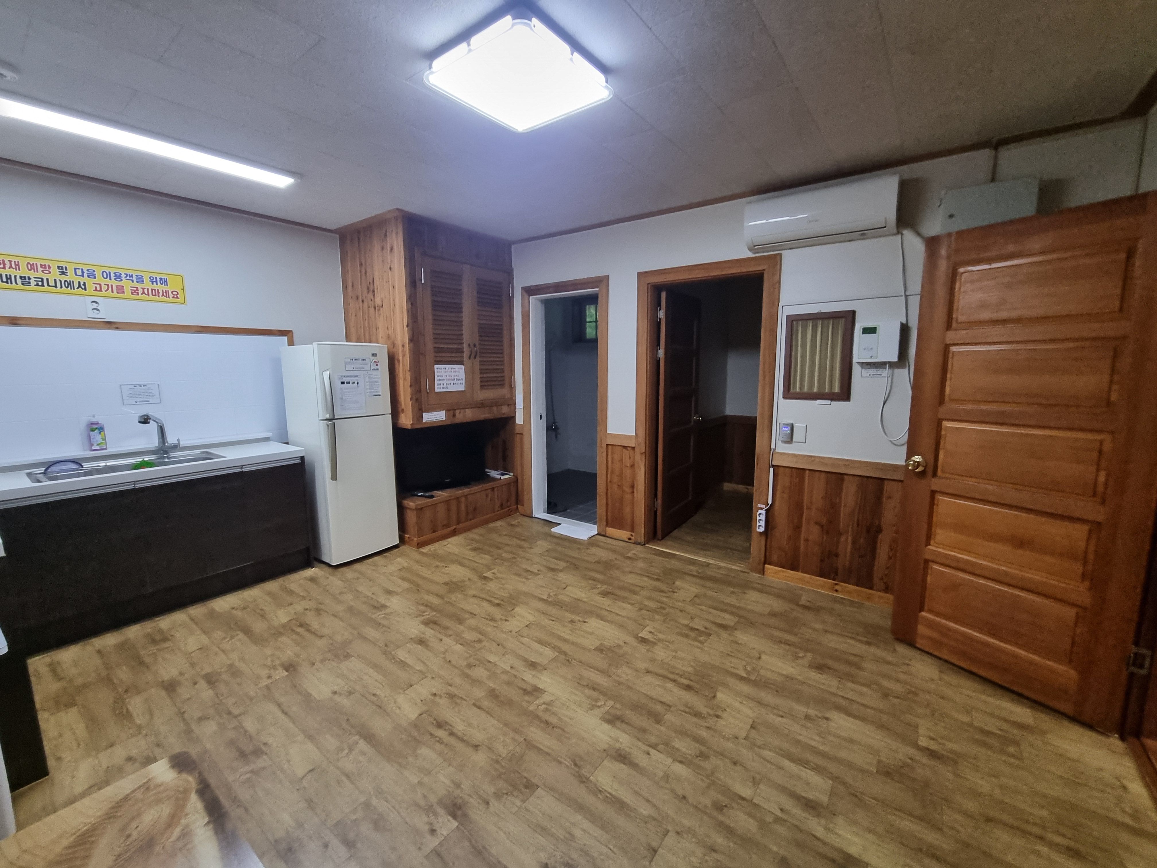 큰 주방이 있고, 중형 냉장고, 이불장 아래에 작은 티비가 있으며 문 왼쪽이 화장실 , 오른쪽이 딸린 방입니다.