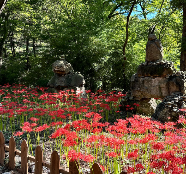 가을 아침, 흥국사 입구에 서면 맑은 공기와 함께 고즈넉한 절의 풍경이 펼쳐집니다. 홍교를 지나 붉게 물든 꽃무릇 사이를 걷다 보면 돌탑과 꽃길이 어우러져 한 폭의 그림처럼 다가옵니다.