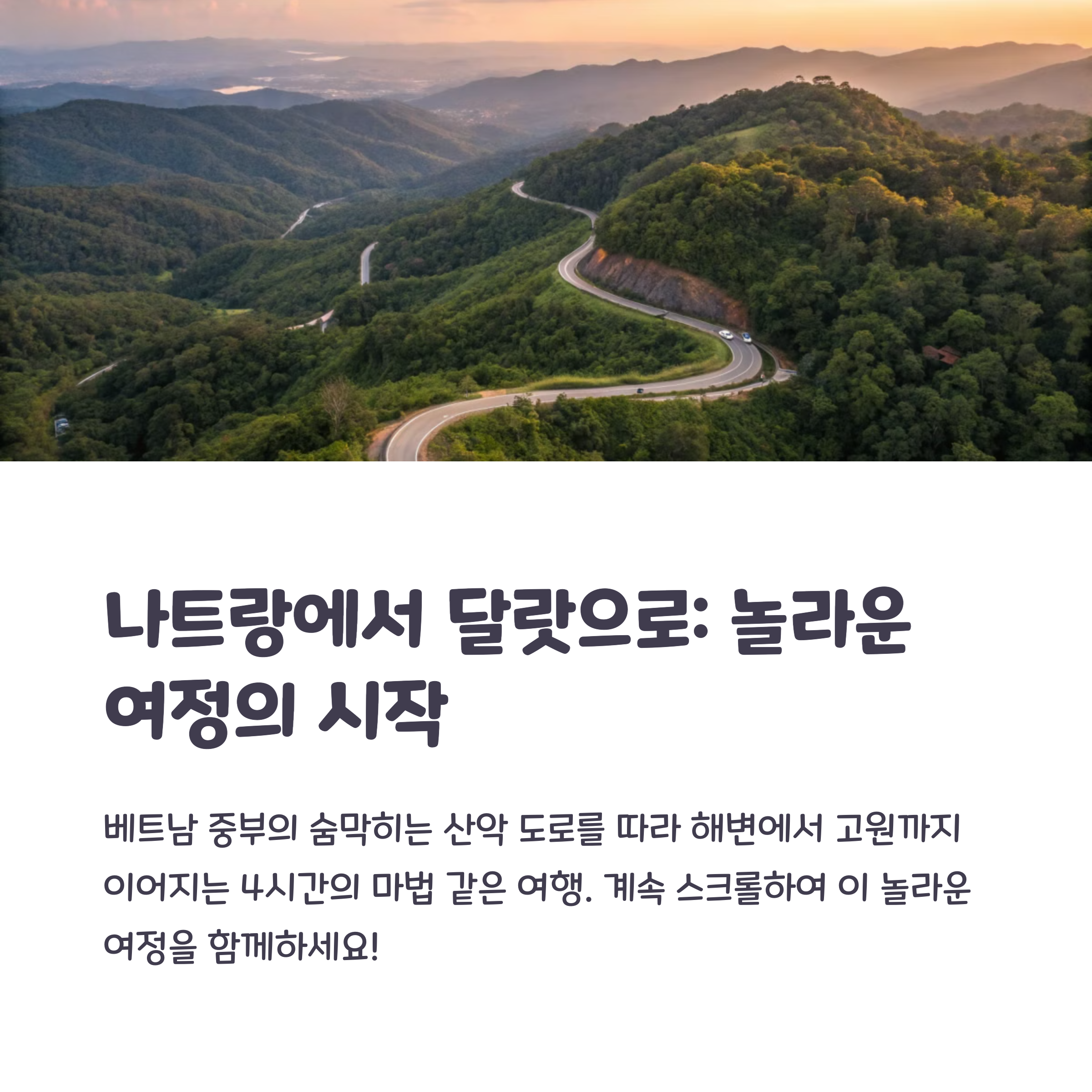 | 산과 구름, 고산지대 넘는 환상적인 드라이브 코스 | 수영, 전통음식, 민속공연이 가능한 문화 휴게소 | 자연+문화 체험이 함께하는 베트남 여행 코스 |