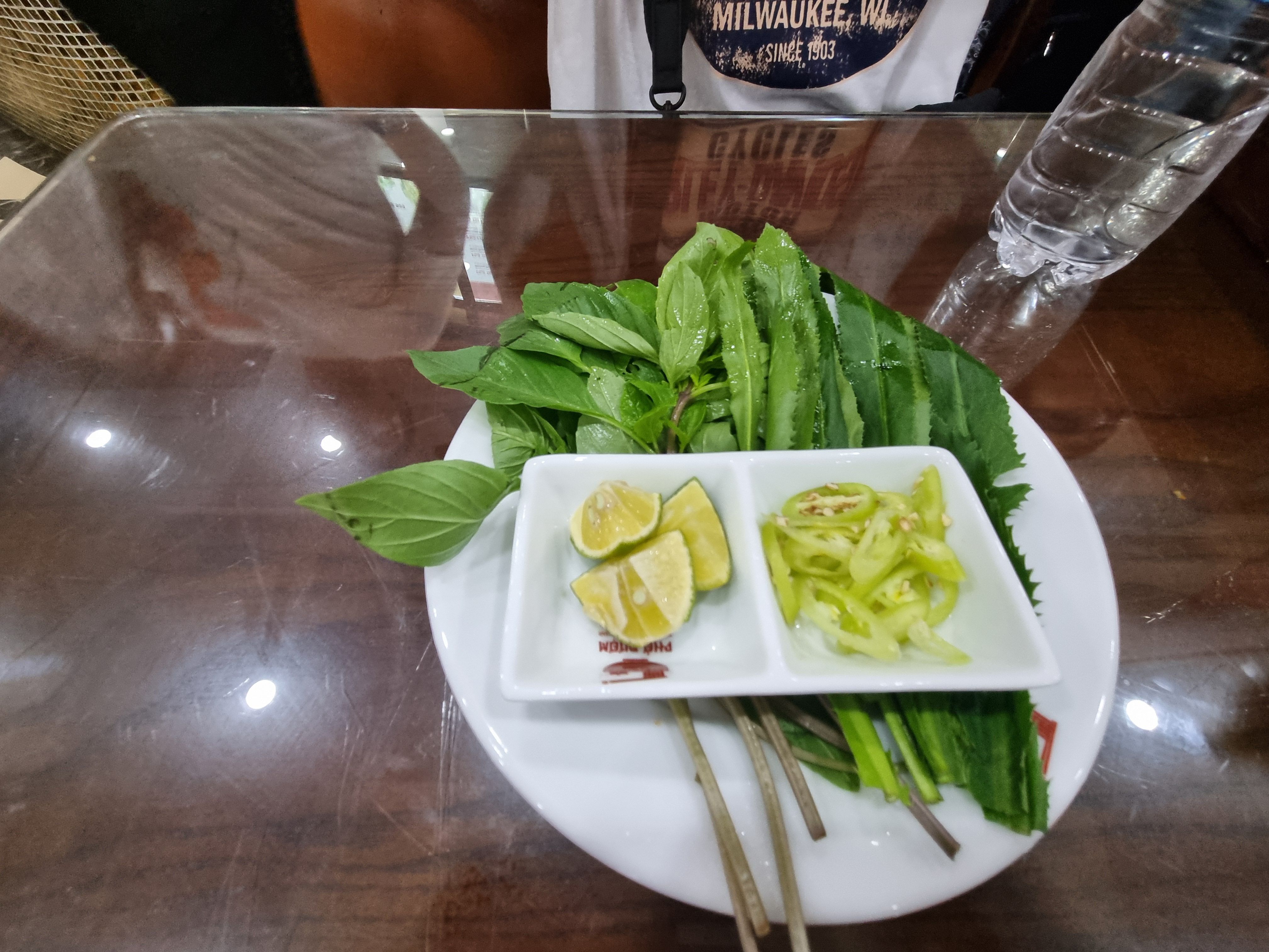 쌀국수에 곁들여 먹을 고수와 이름은 잘모르는 향신채를 듬뿍주고 라임과 청고추같은걸 주는데 저 고추 조심해야 합니다. 우리나라 청양고추정도로 생각하면 큰코 다치죠. 엄청맵기 때문에 매운거 못 드시는분들은 젓가락도 대지 마세요.