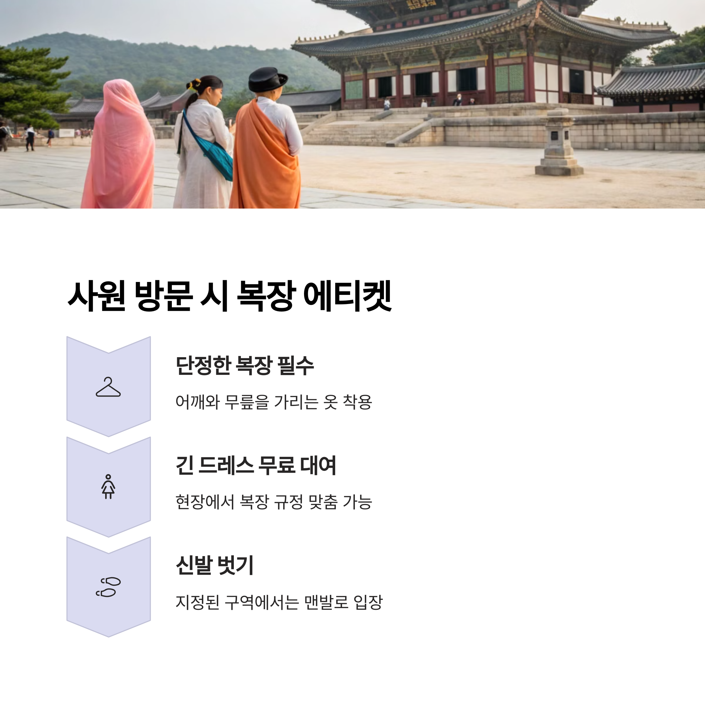 입장 시에는 단정한 복장을 갖추는 것이 예의이며, 복장 규정을 준수하지 않을 경우 현장에서 긴 드레스를 무료로 대여할 수 있어 편리하게 이용할 수 있습니다. 특히 사원을 방문할 때는 어깨와 무릎을 가린 옷차림을 기본으로 준비하시는 것이 좋습니다.