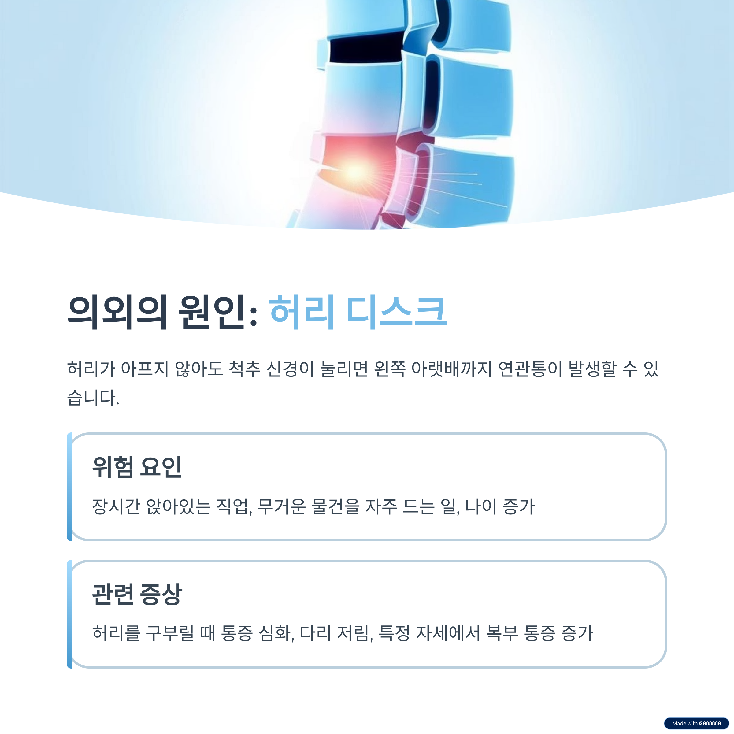 "허리가 아프지도 않은데 왜 배가 아프지?"라고 생각할 수 있지만, 척추 신경이 눌리면 왼쪽 아랫배까지 연관통이 발생할 수 있어요.
