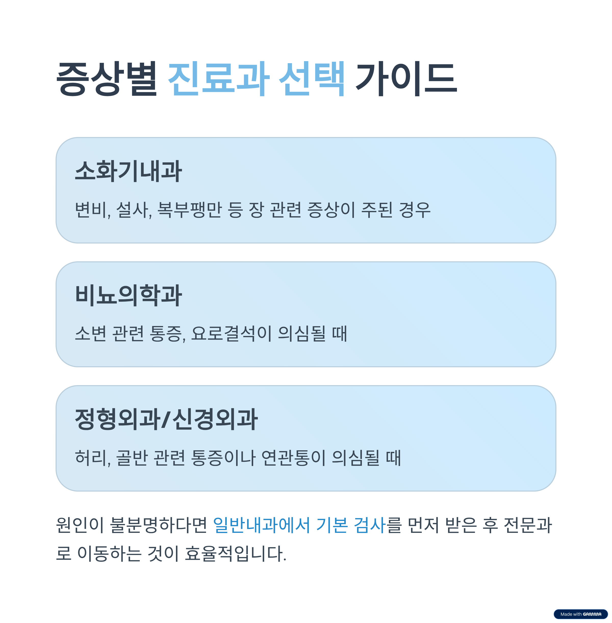 게실염, 요로결석, 근골격계 질환 등 다양한 원인과 정확한 병원 선택 방법을 알려드립니다.