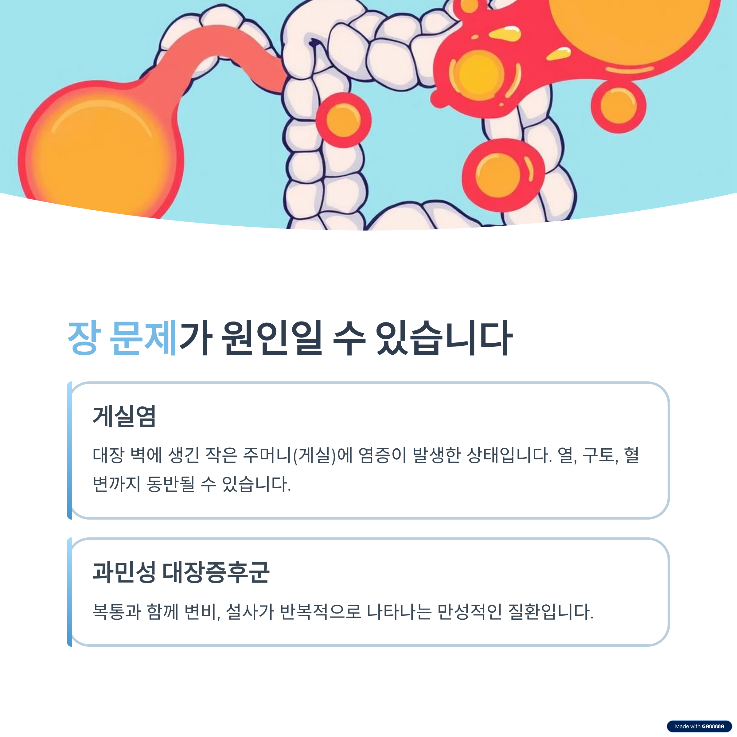 또 과민성 대장증후군도 원인 중 하나죠. 복통과 함께 변비, 설사가 반복된다면 이 가능성도 염두에 두셔야 합니다.